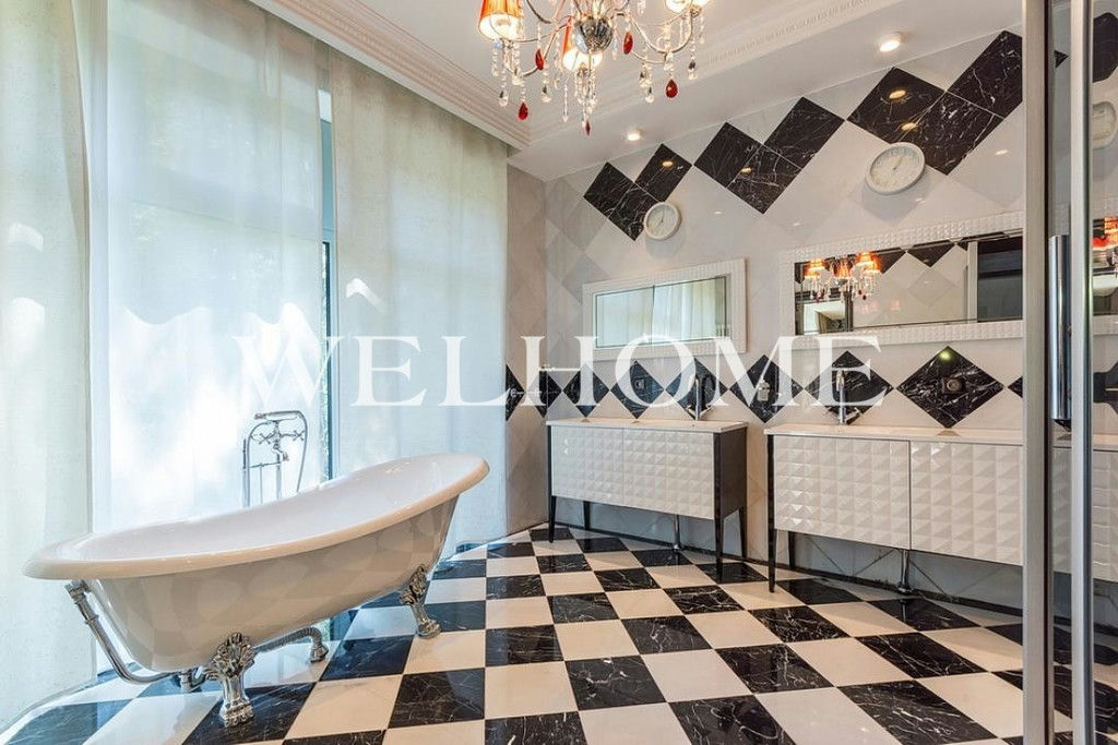 ID объекта на сайте Welhome: ZA-3912. Предлагается дом на лесном участке в камерном поселке. Фасад отделан камнем и деревом, выполнено панорамное остекление. В доме предусмотрены: бассейн, бильярдная, патио-терраса, эксплуатируемая кровля. Выполнен дорогой ремонт с дизайнерской мебелью. Отдельное здание для персонала на участке с хвойными деревьями. Детская площадка. Парковка.Поэтажное описание: Цоколь: бассейн, сауна, зона отдыха, бильярдная, гардеробная, веранда, с/у.1 этаж: гостиная, кухня-столовая, гардеробная, веранда, с/у.2 этаж: 3 спальни с гардеробными и с/у.3 этаж: спальня, зона отдыха, патио-терраса, с/у.