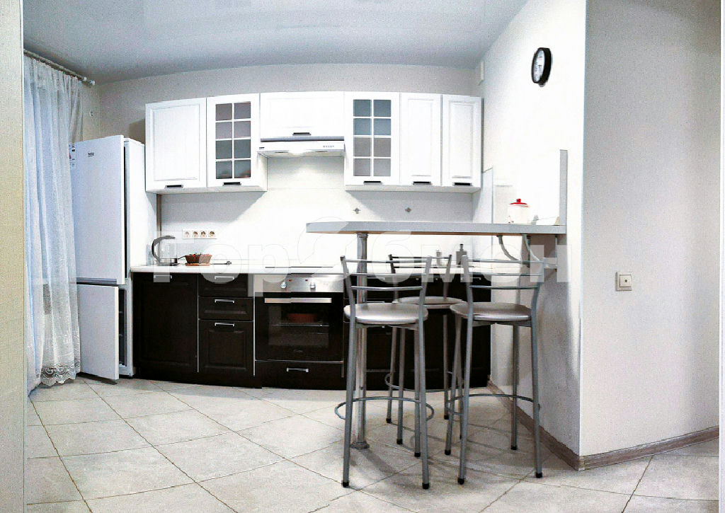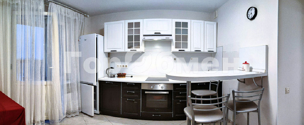 Кухня: Кухонный гарнитур, варочная панель, вытяжка, духовой шкаф, холодильник, электрический чайник. Обратите внимание, что между кухней и комнатой отсутствует дверь, что создает ощущение единого пространства.