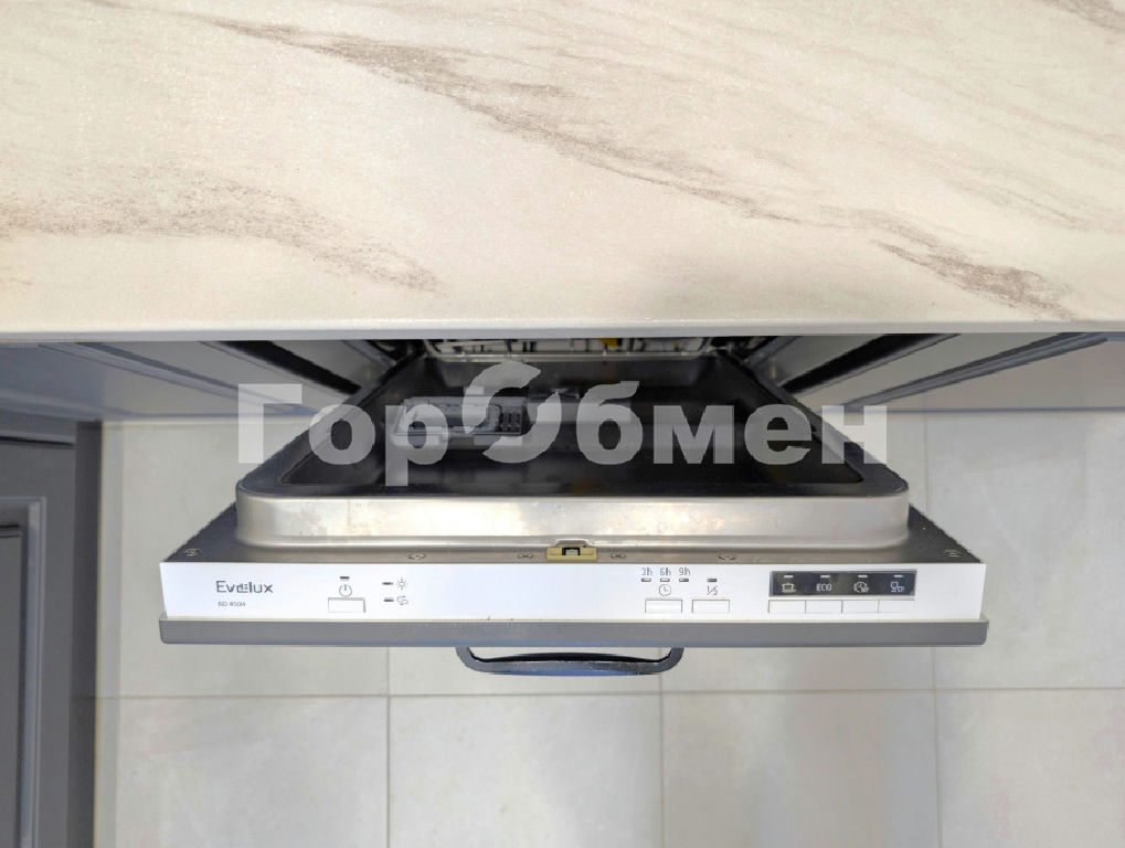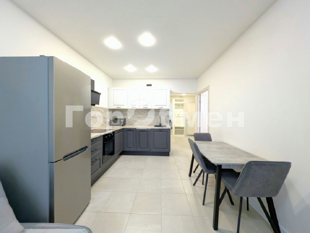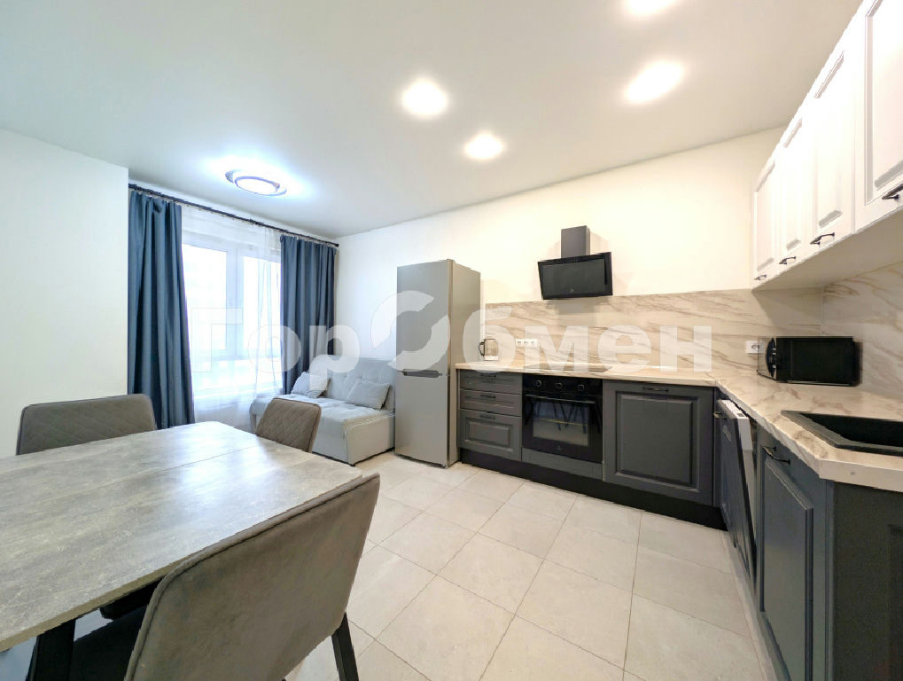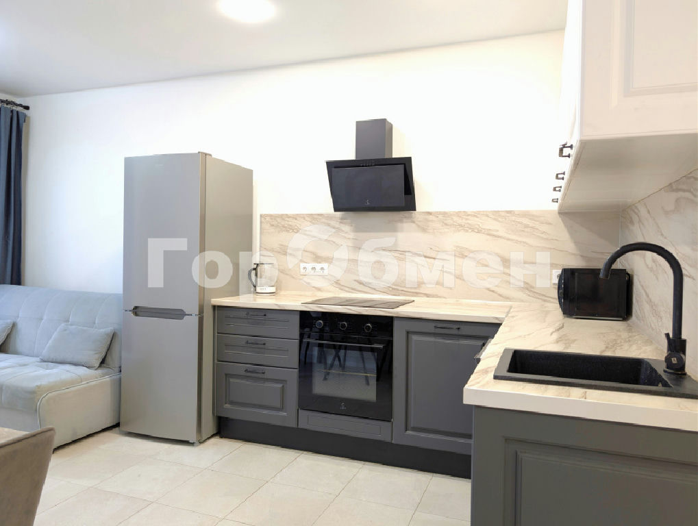 Просторная кухня-гостиная укомплектована современным гарнитуром и всей необходимой техникой: посудомоечная машина, холодильник, варочная панель, духовой шкаф, микроволновая печь, чайник, вытяжка. Для отдыха установлен удобный диван и обеденная группа.