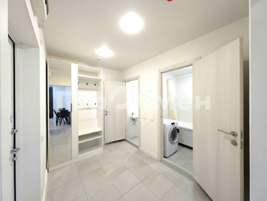 В изолированной спальне большая двуспальная кровать с матрасом и подъемным механизмом, что дает много дополнительного места для хранения. Также в комнате установлен вместительный шкаф-купе. В прихожей оборудована зона для верхней одежды и обуви. Раздельный санузел.