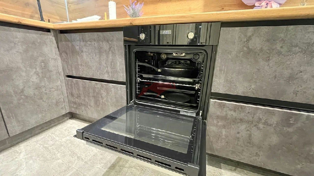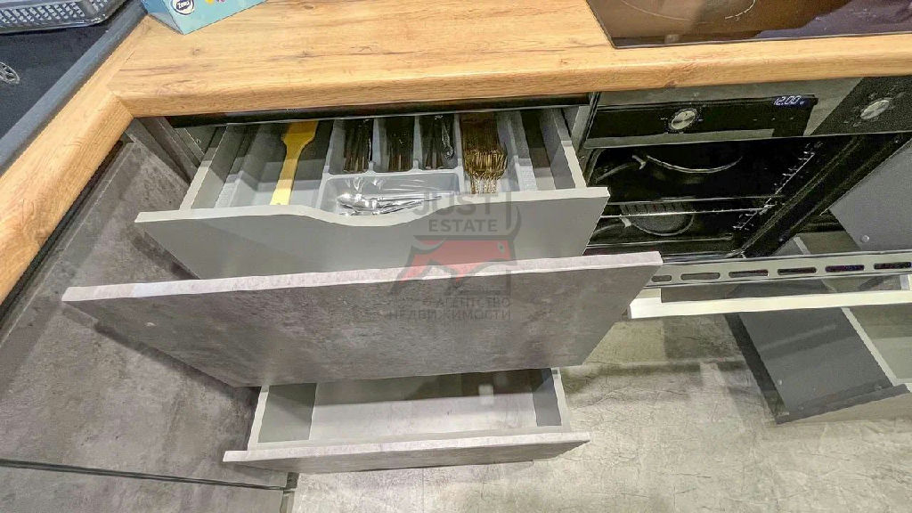 Функциональный современный кухонный гарнитур с встроенной варочной панелью, духовым шкафом, вытяжкой и посудомоечной машиной. Новый холодильник и микроволновая печь.