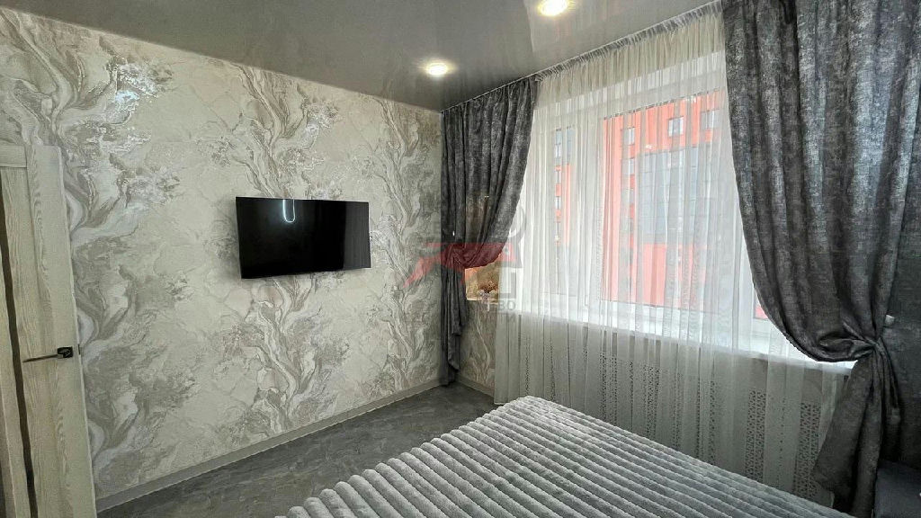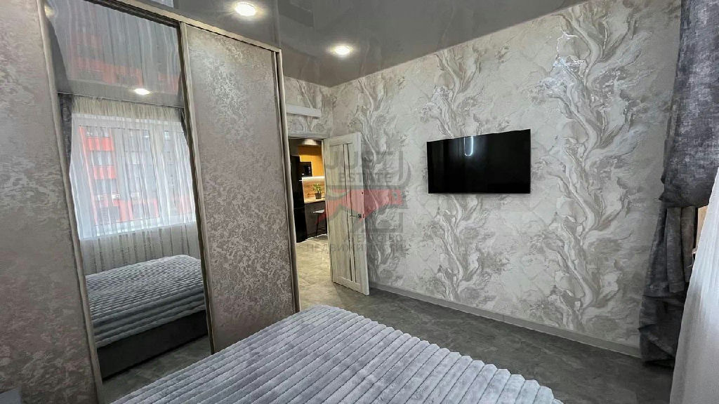 В спальне удобная и комфортная 2-х спальная кровать, шкаф-купе и телевизор.