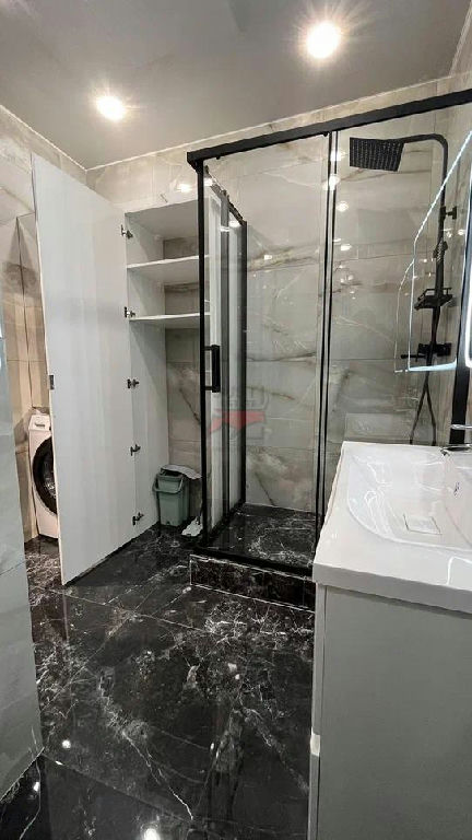 Ванная комната с душевой кабиной и качественной эстетичной сантехникой.