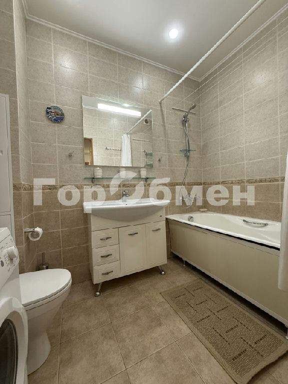 В спальной: кровать, туалетный столик с возможностью использования в качестве рабочего места, шкафы для книг, документов и одежды На кухне: встроенный гарнитур, стол с табуретами и диванчиком, холодильник, варочная панель и духовой шкаф, вытяжка В ванной комнате, благодаря правильному размещению имеются: унитаз, тумба с раковиной и зеркалом, большая ванная и стиральная машина