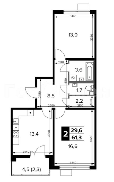 Общая: 61,3 м2