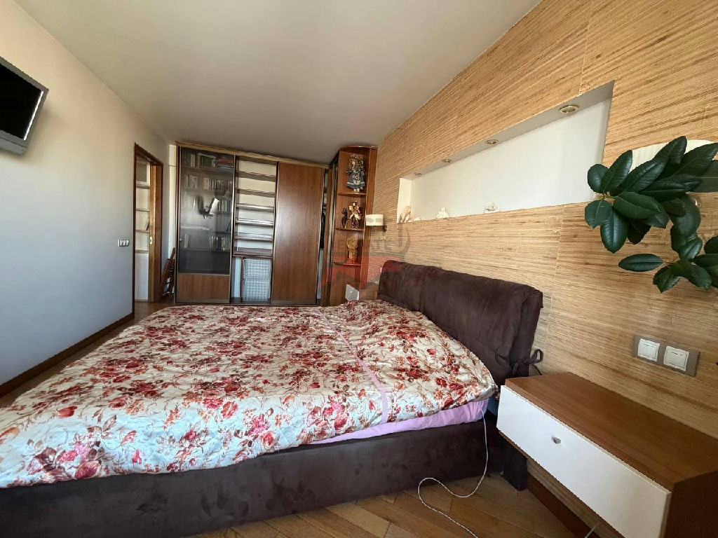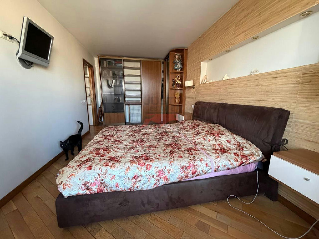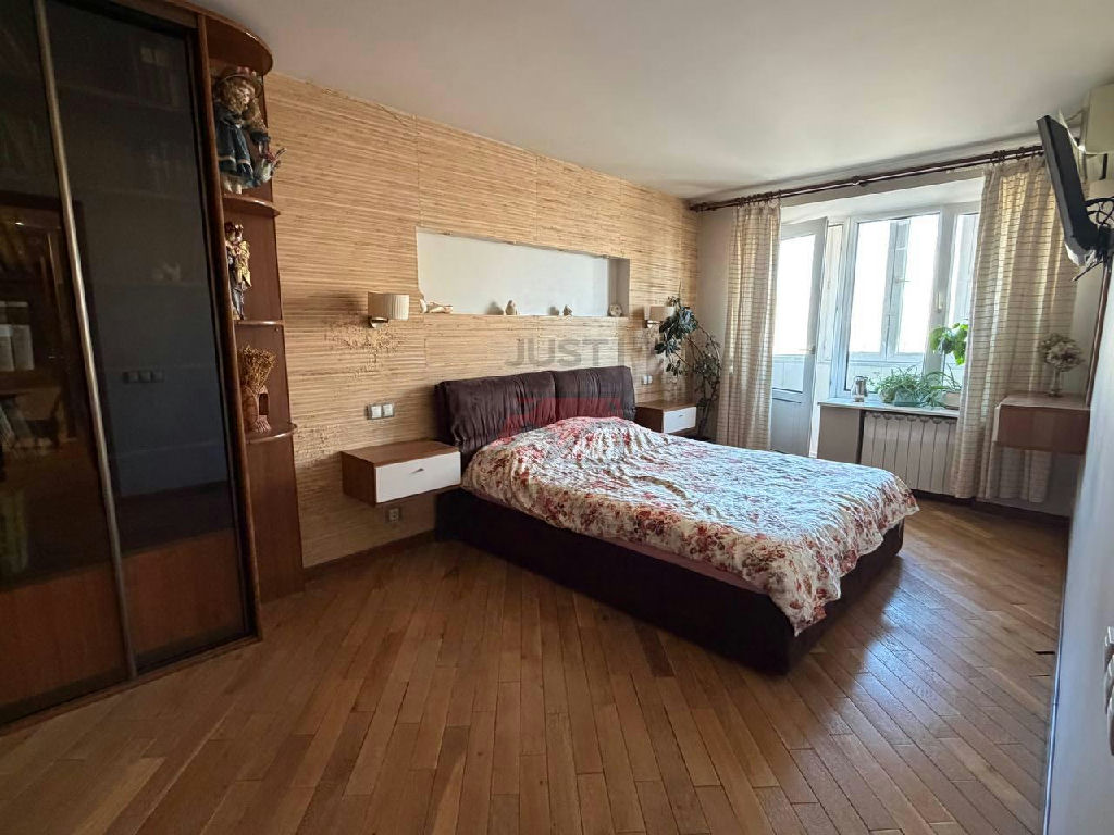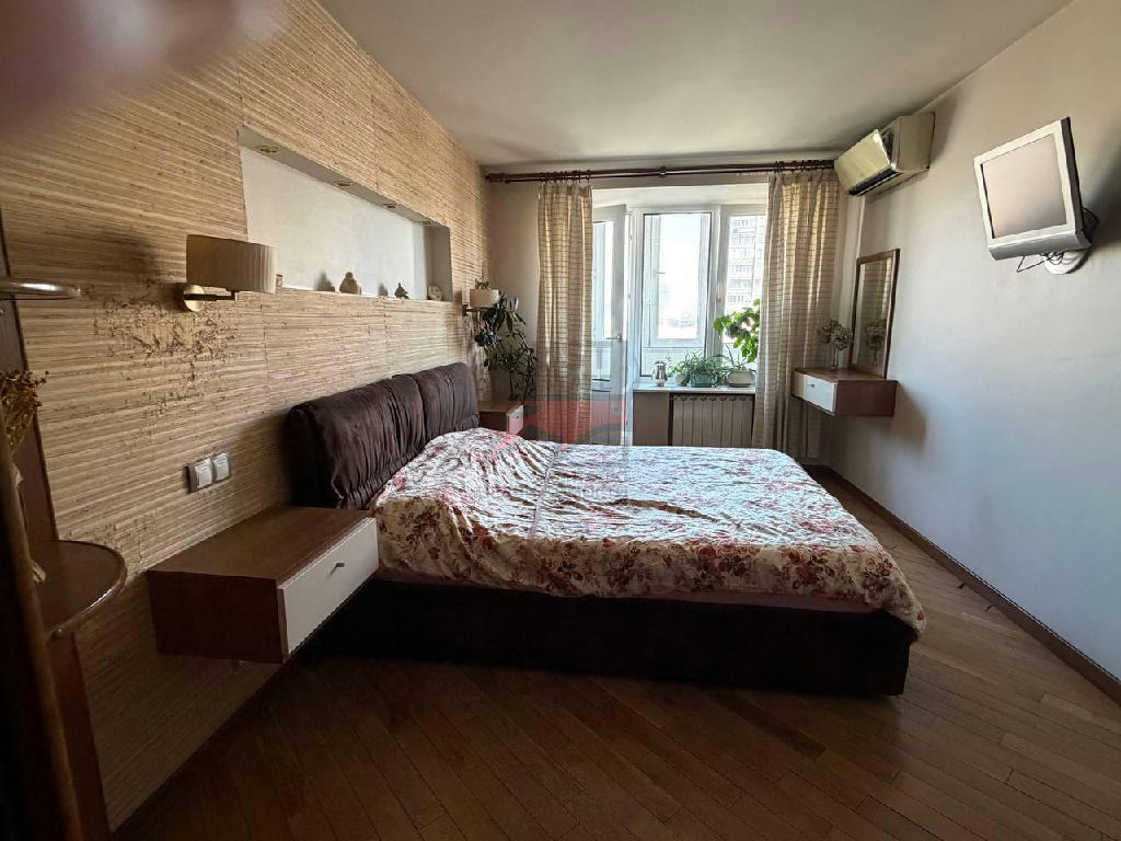 Просторная спальня совмещена с балконом, в квартире имеются 2 кондиционера, что помогает поддерживать приятный климат.