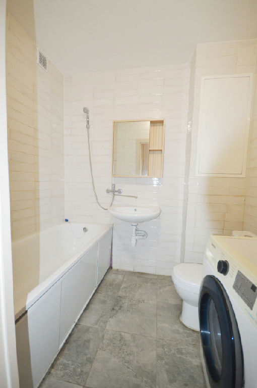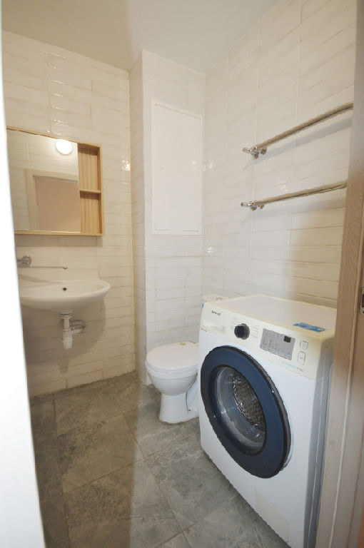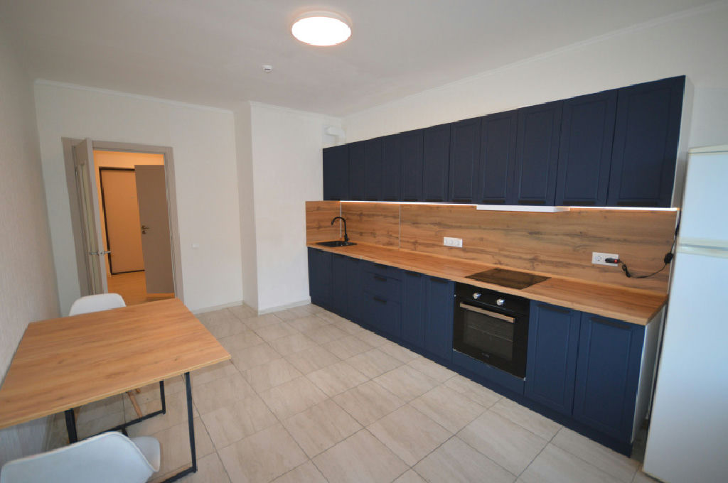 Установлен кухонный гарнитур, холодильник и стиральная машина.
