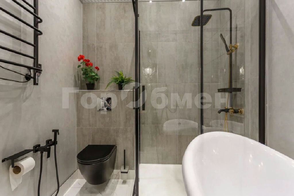 * 1-й: ванна (отдельно стоящая), душевая кабина, туалет, раковина с комодом, гигиенический душ.