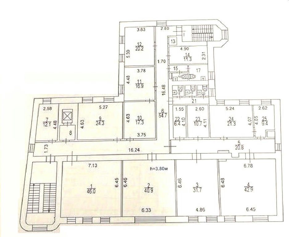 Коридорно-кабинетная планировка (10 кабинетов), оборудованная кухня и санузлы.