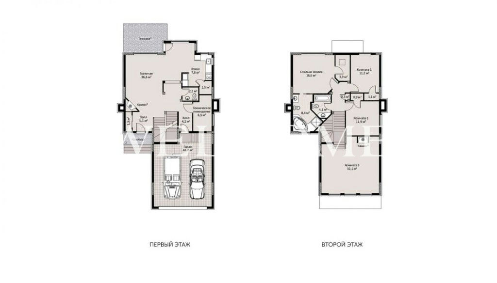 1 этаж: 2 холла, кухня-гостиная, с/у, техническое помещение, гараж на 2 м/м;