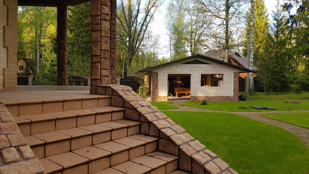 Отдельно стоящая баня в стиле шале 55 м 2 (пеноблок, бревно) парилка с дровяной печью и зоной отдыха с камином (возможно отопление и горячее водоснабжение газовым котлом); оборудованная зона барбекю 48 м 2 (пеноблок) с водоподведением.