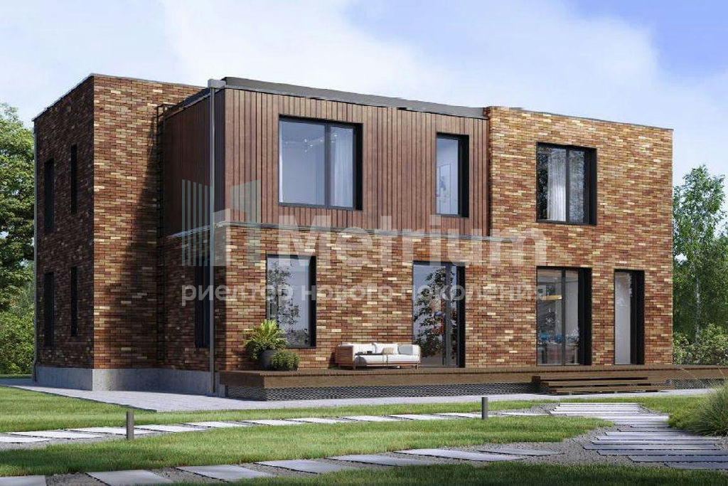 За счёт смещения объёмов и разнонаправленности кирпичной кладки экстерьер смотрится представительно и актуально. Функциональная планировка позволяет разместить на первом этаже просторную кухню-гостиную, кабинет, ванную комнату и гардеробную, а также хозяйственные помещения: полностью оборудованную котельную и кладовую. В зоне гостиной предусмотрено место для установки камина, здесь же находится выход на личную террасу. На втором этаже расположены мастер-спальня, две детские, а также две гардеробные и ванные комнаты.