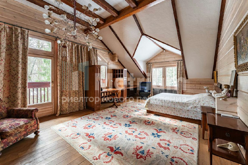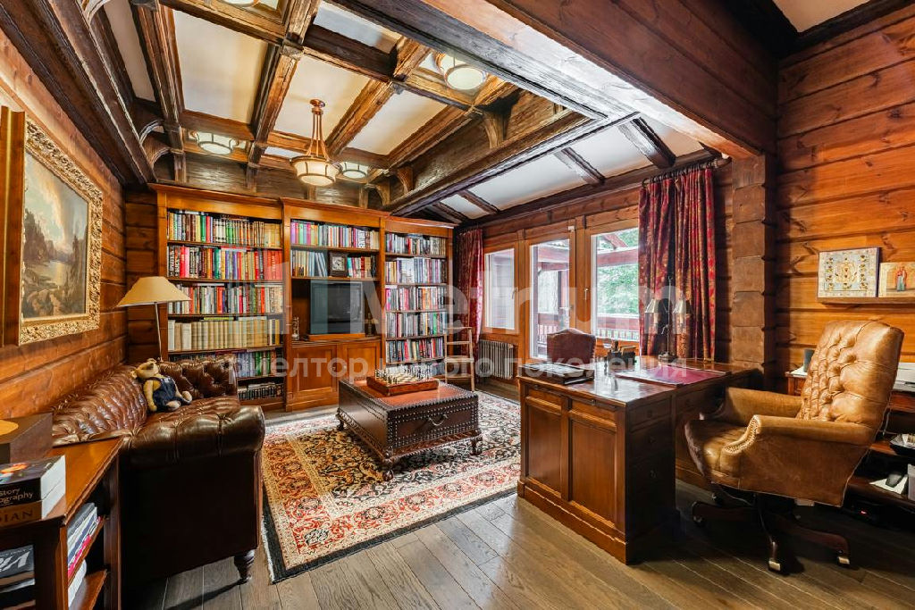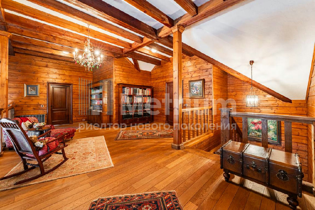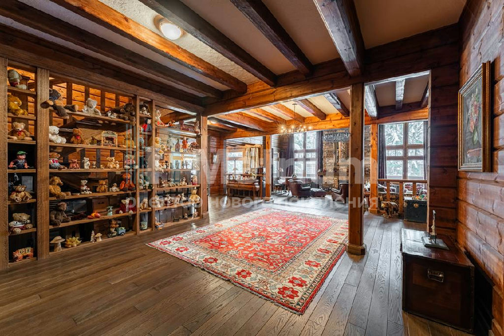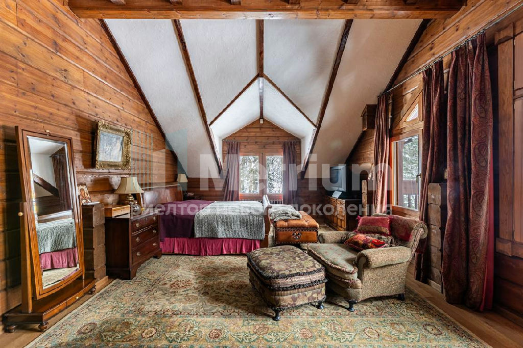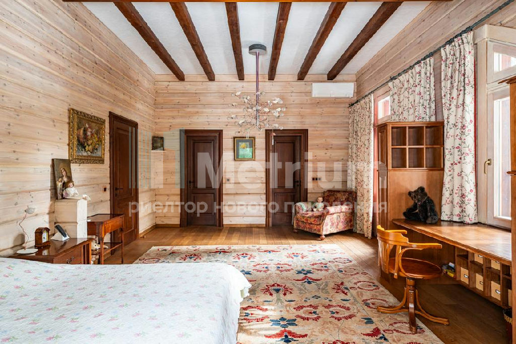 Коттедж с 4-мя спальнями, общей площадью 600 кв.м, расположен на живописном лесном участке 52 сотки. Дом, в котором можно отдыхать душой и телом, благодаря уникальному интерьеру в едином загородном стиле, по проекту известного дизайнера Мурата Сахтарьек. Изюминкой дома является великолепная гостиная, которую украшает австрийский рояль конца XIX века. Вся мебель и предметы декора представлены известными производителями: люстра от "Anthologie Quartet", стол - "Ralph Lauren", кресло от "Henredon", стулья - "Andy Tornton", сервировочный столик - "Roche Bobois", диваны от "English Interiors". Большие окна, высокие потолки (до 5.5 метров в гостиной), второй свет в гостиной делают коттедж очень светлым. В доме оборудована спа-зона с сауной, для полного расслабления, и спортивный зал. Также предусмотрен блок для персонала с отдельным входом, где есть кухня, гостиная и спальня.
