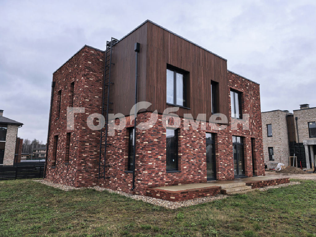 Площадь 2-этажного дома 259,2 кв.м. Стильный коттедж Berry с двумя парковочными местами воплощает эстетичную лаконичность и функциональность. Фасад дома выполнен в кирпиче ручной формовки природного терракотового оттенка и планкене светлого цвета.