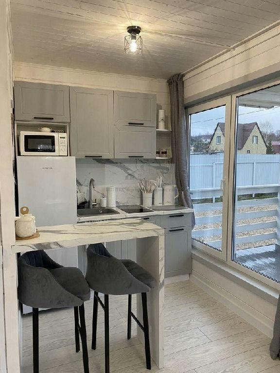 * кухня-гостиная, оборудованная новой мебелью и техникой;