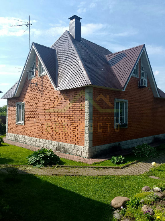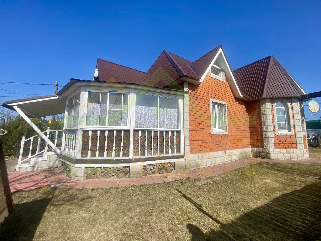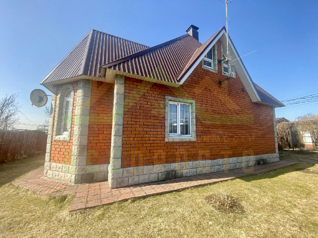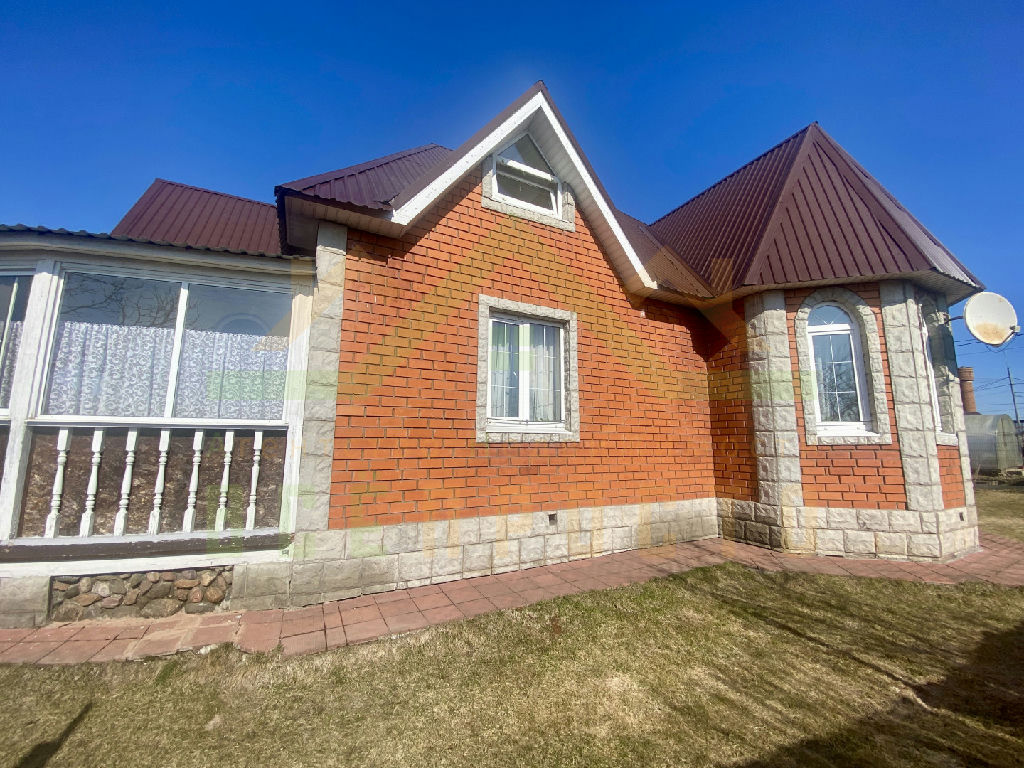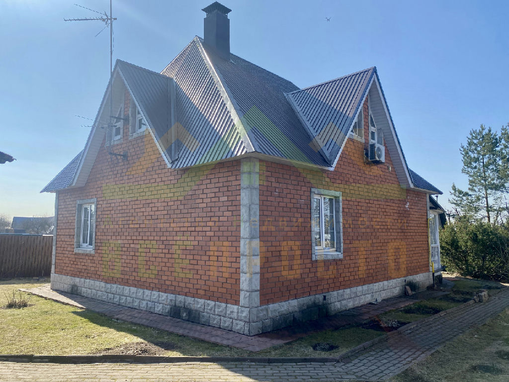 Дом построен из пеноблоков, отделан красным кирпичом, фундамент - ленточный, кровля металлочерепица.