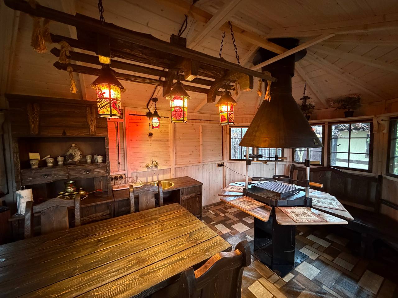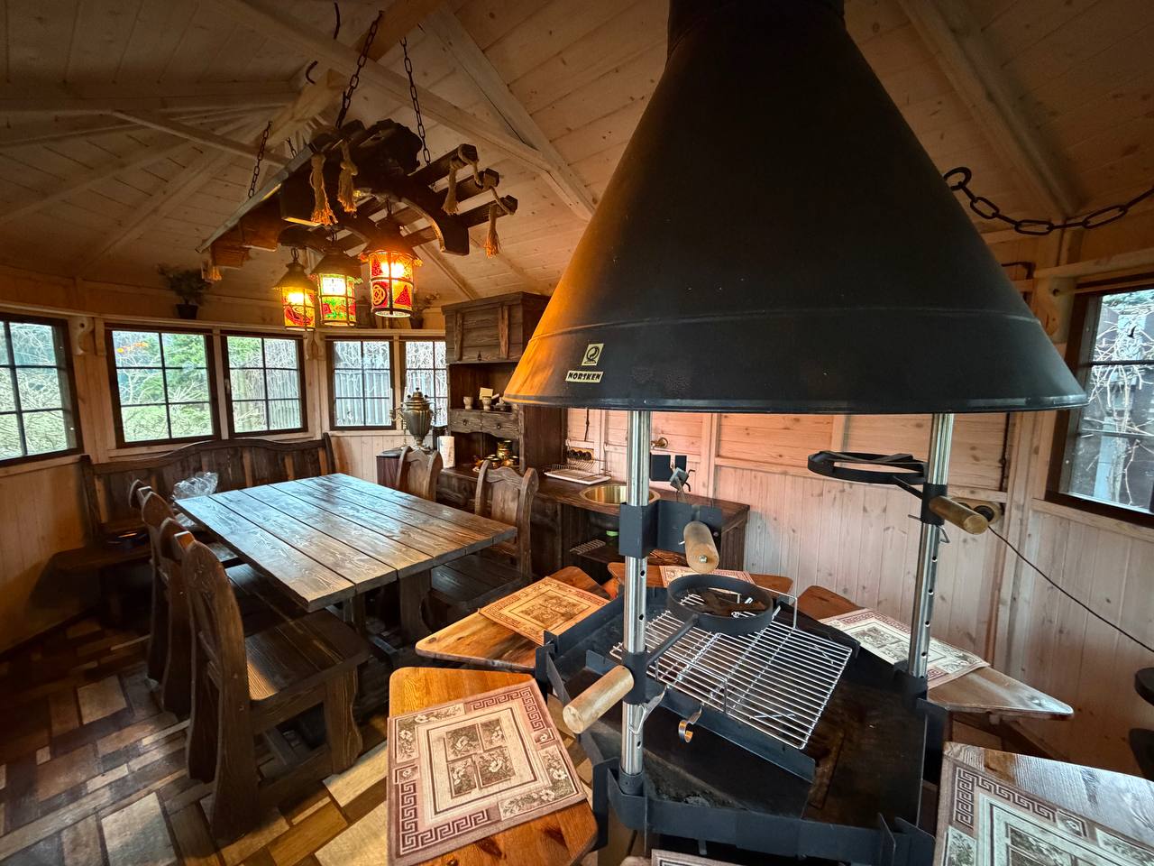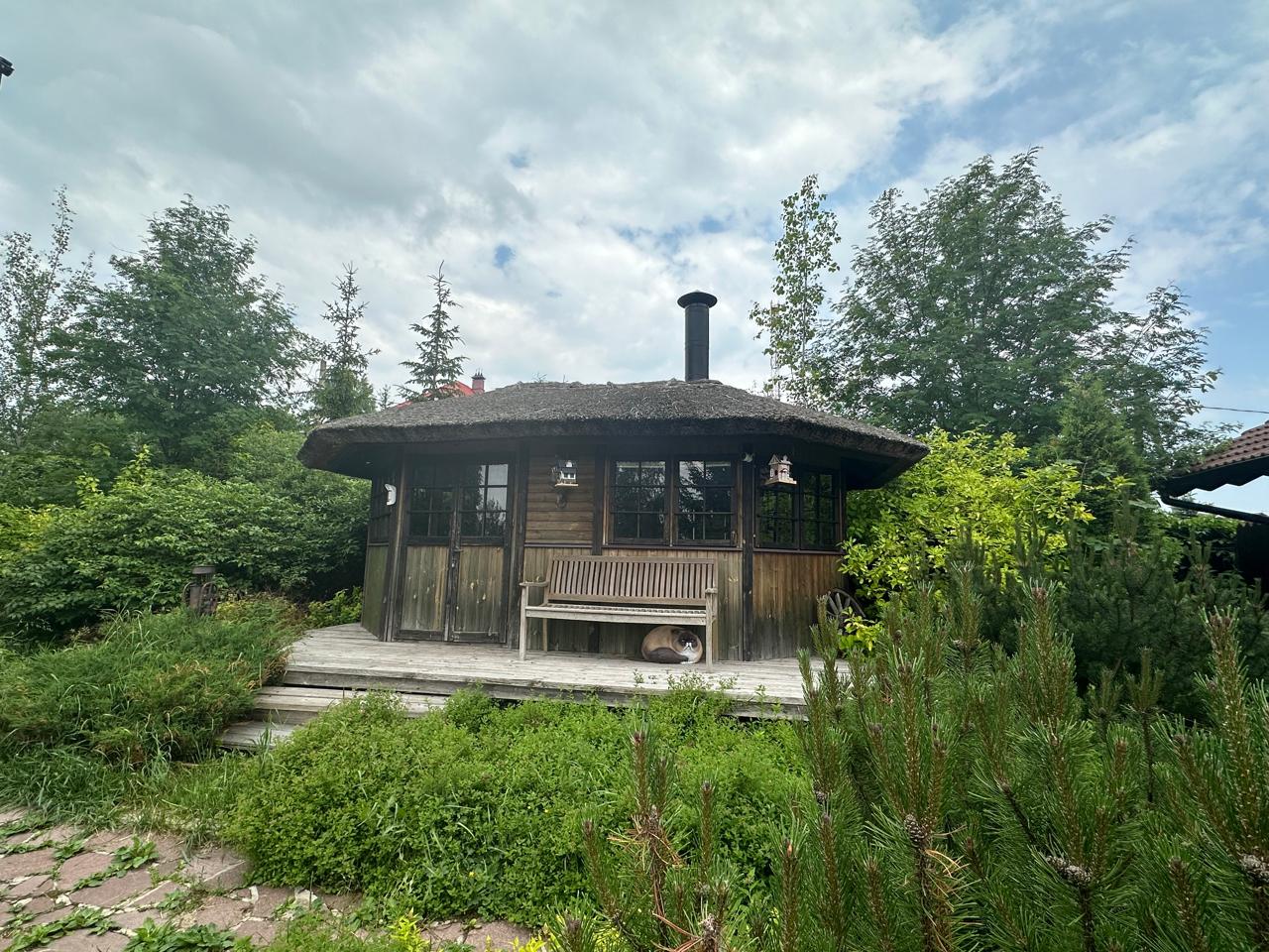 • Финская беседка с зоной барбекю и очагом станет любимым местом для семейных ужинов и встреч с друзьями, даря незабываемые моменты у живого огня.