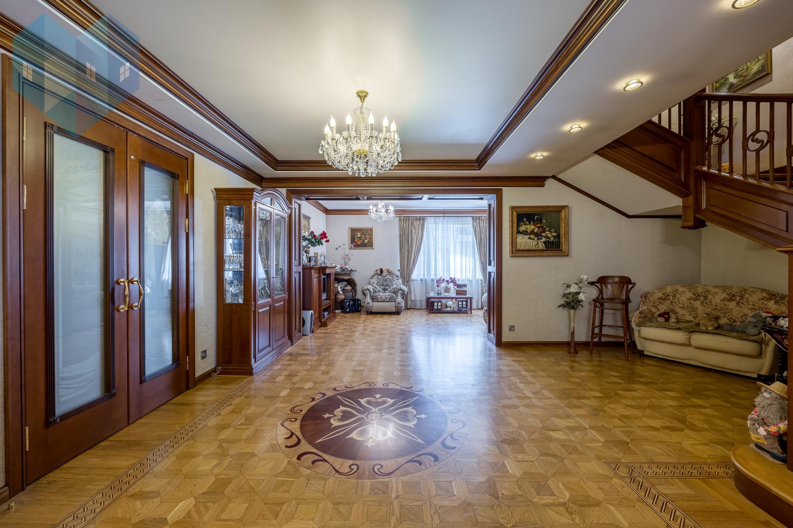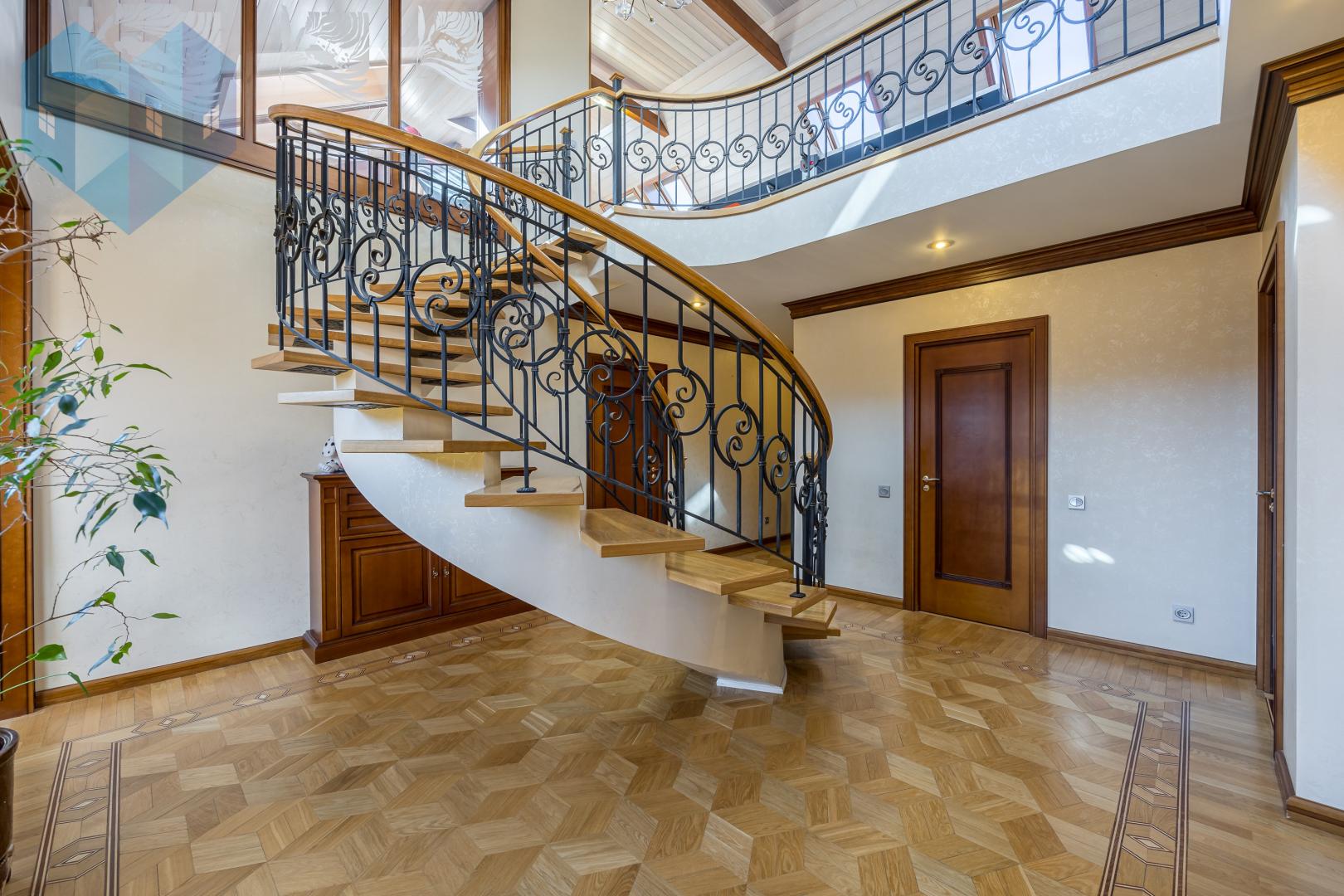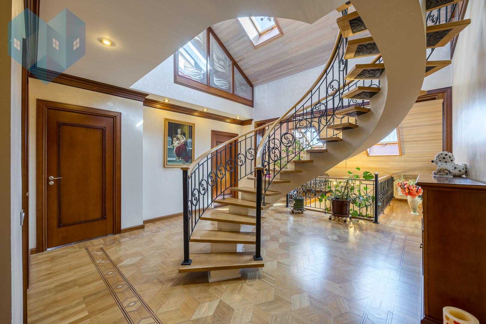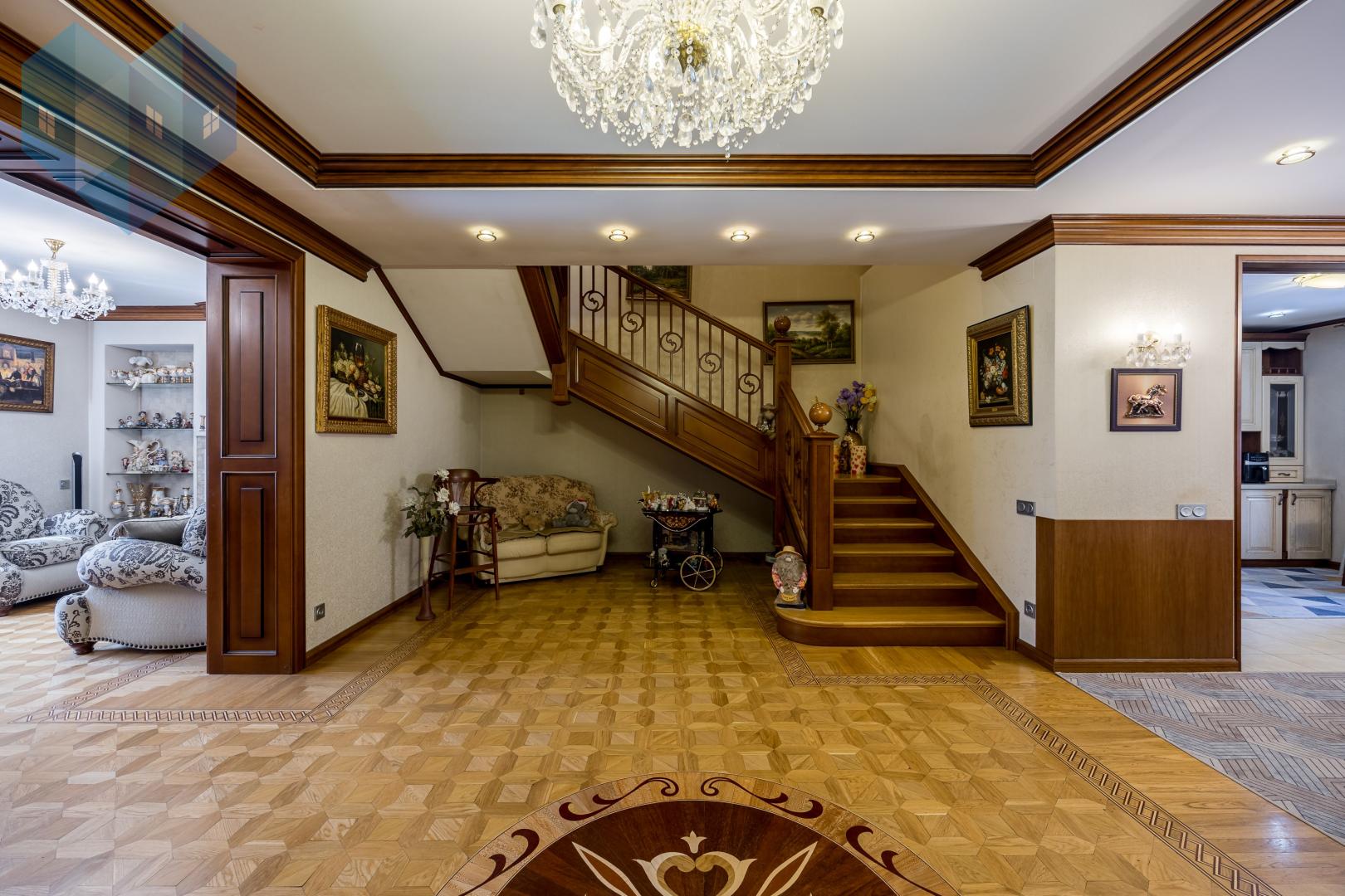 Во внутренней отделке дома использованы премиальные материалы: художественный паркет, венецианская штукатурка, тканевые обои, двери и мебель из массива.
