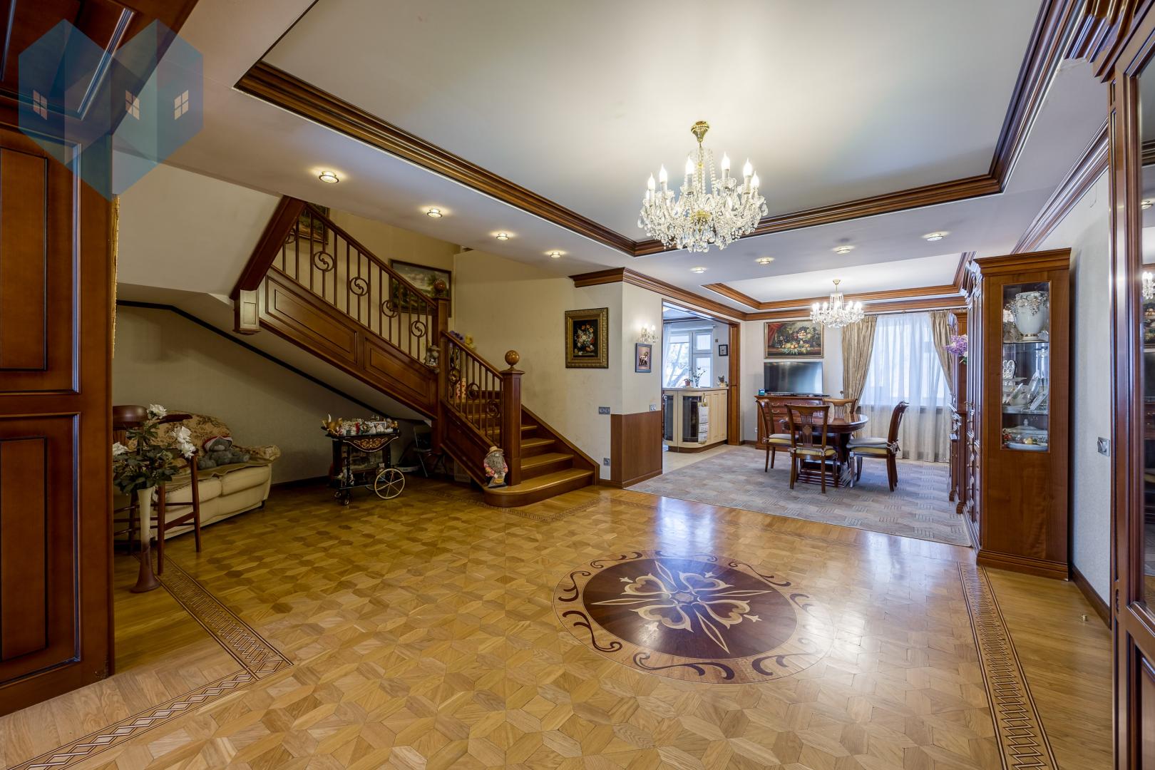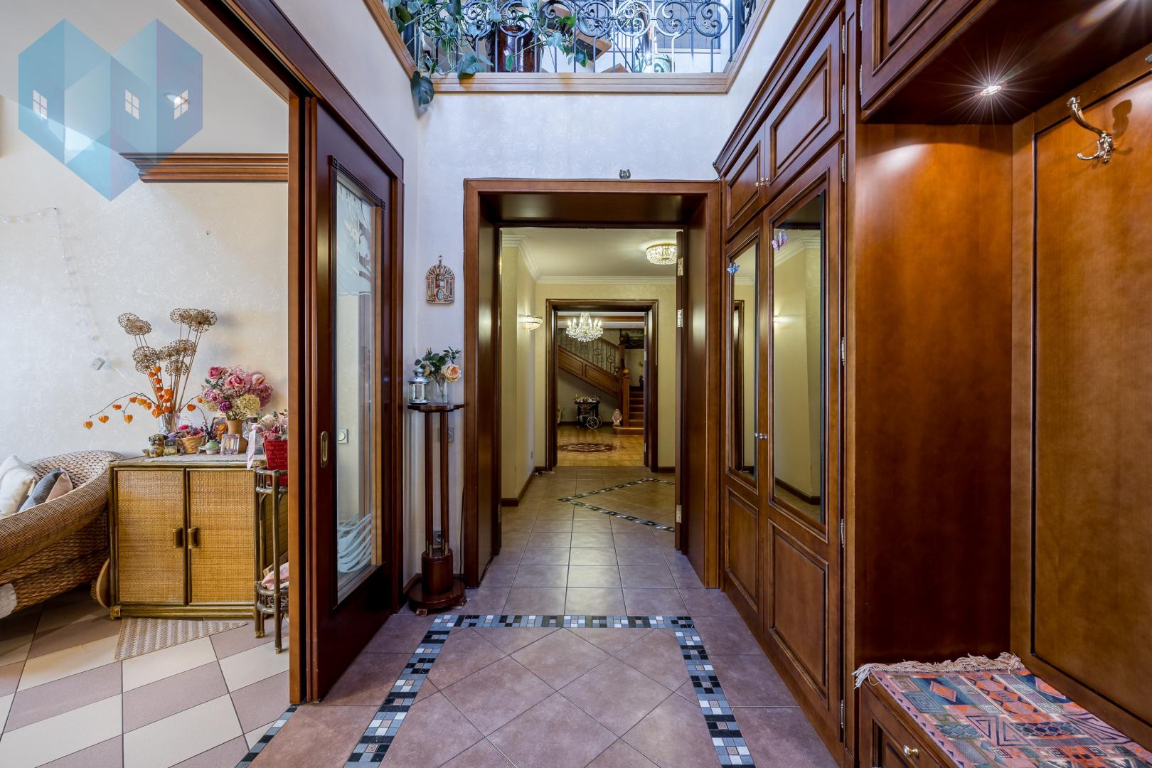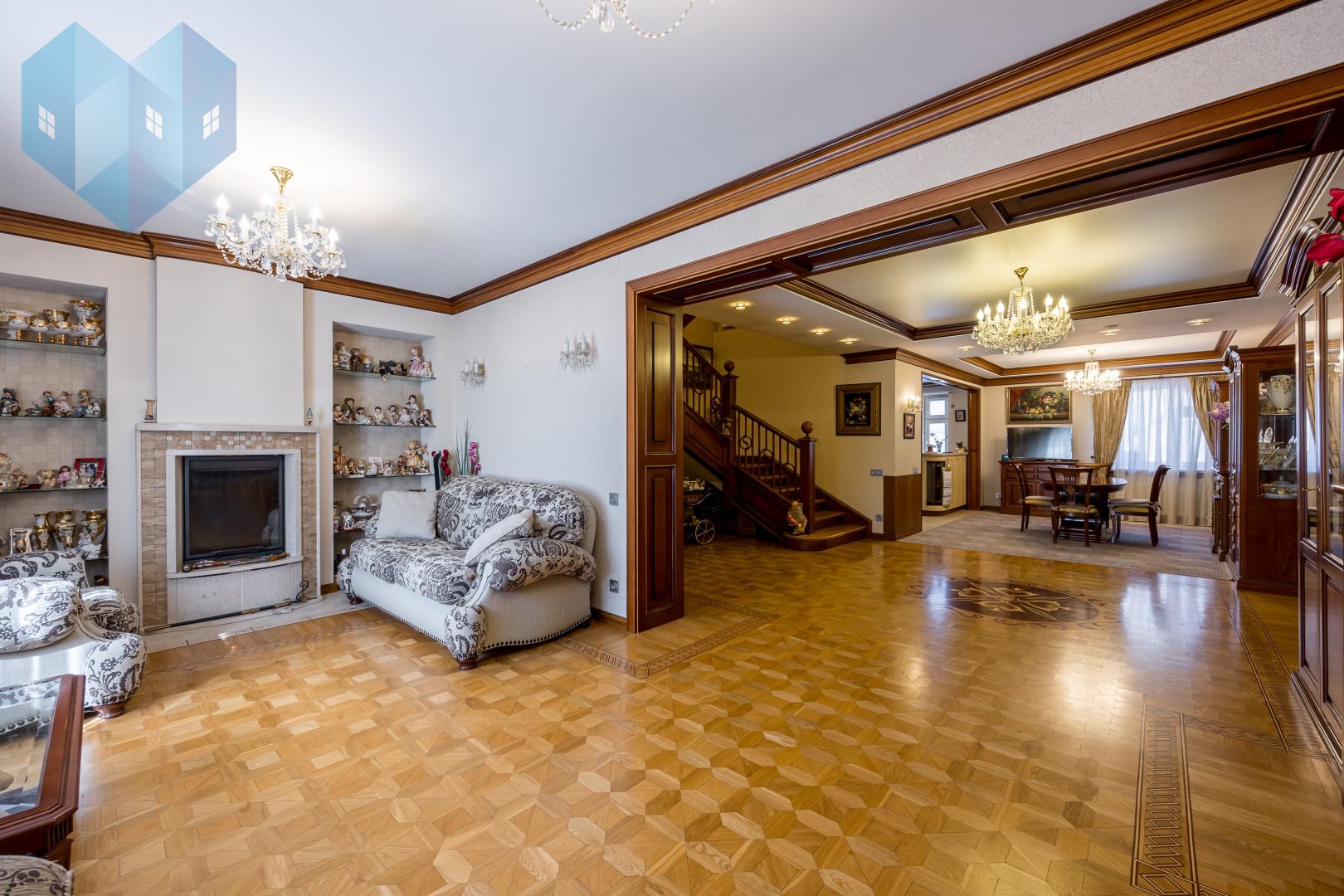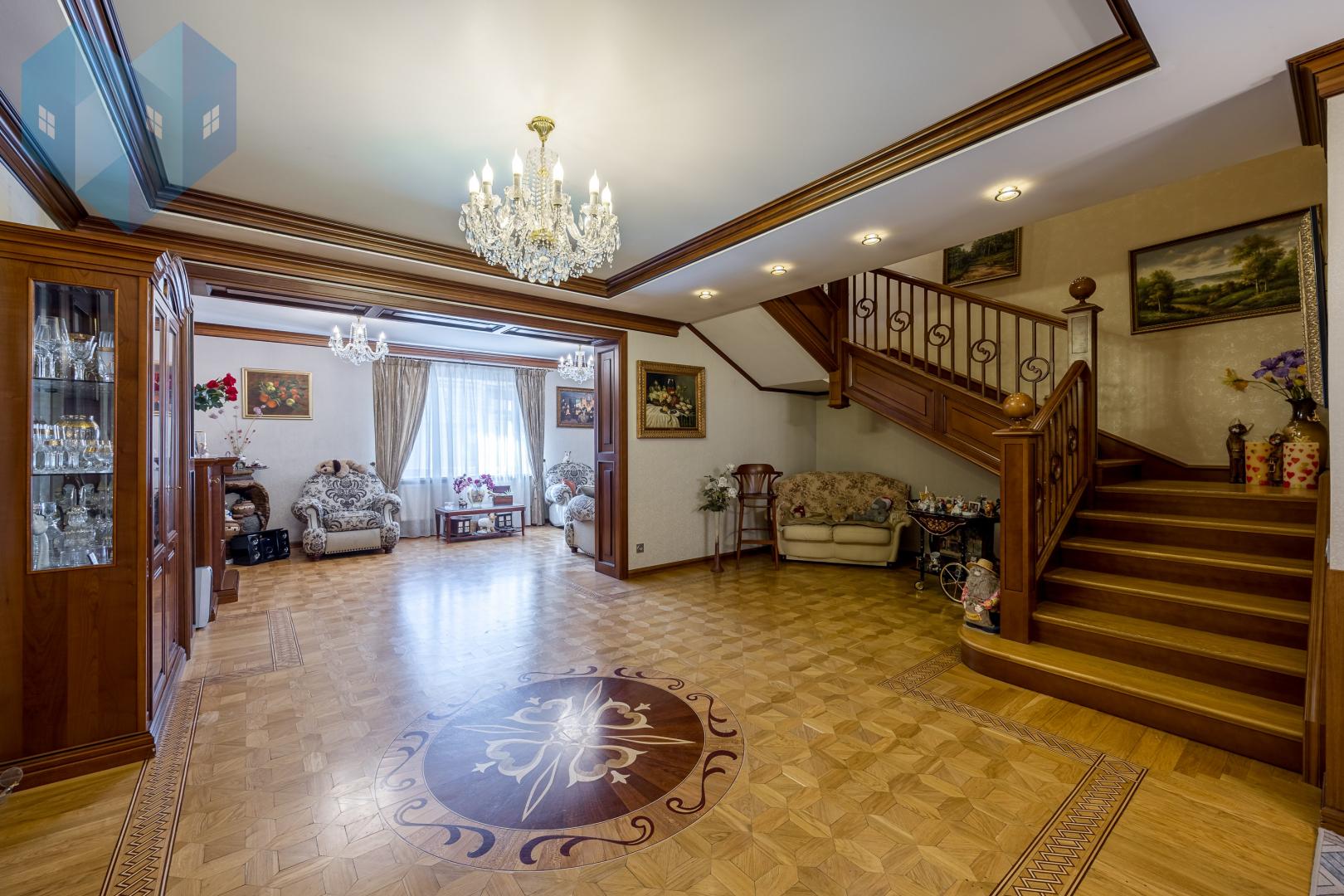 Во внутренней отделке дома использованы премиальные материалы: художественный паркет, венецианская штукатурка, тканевые обои, двери и мебель из массива.