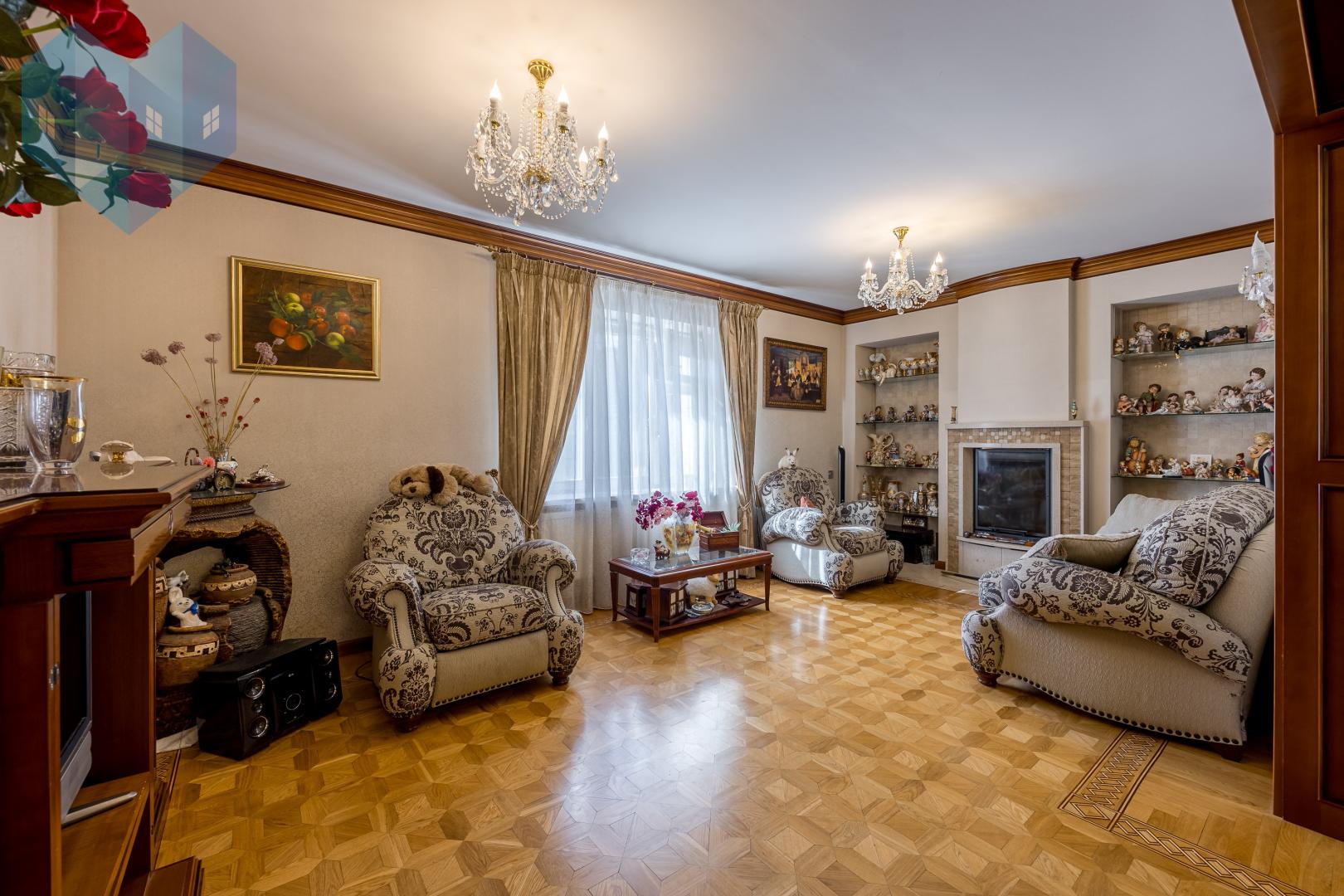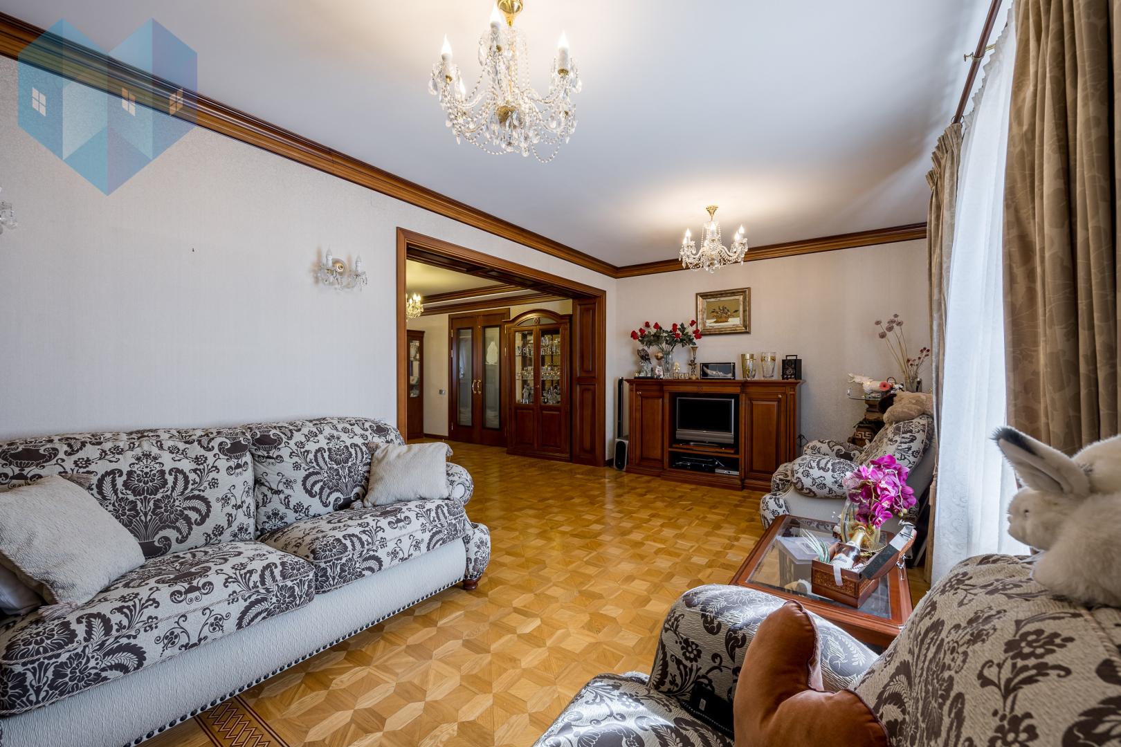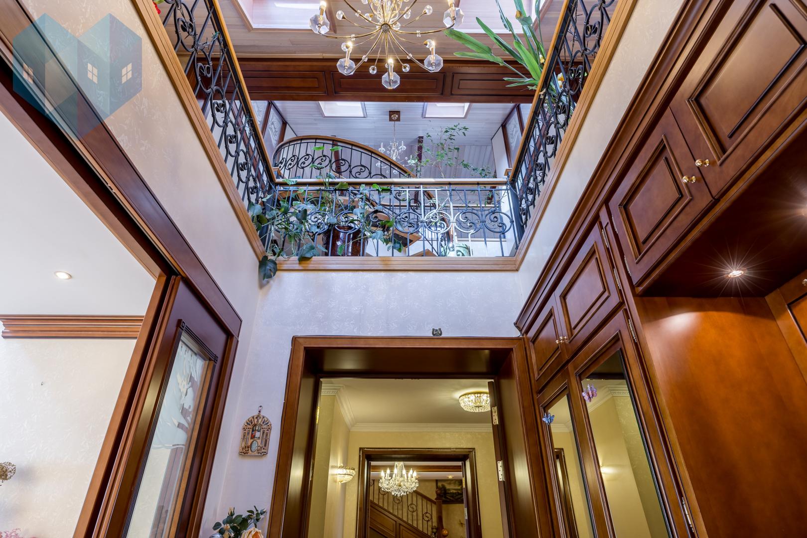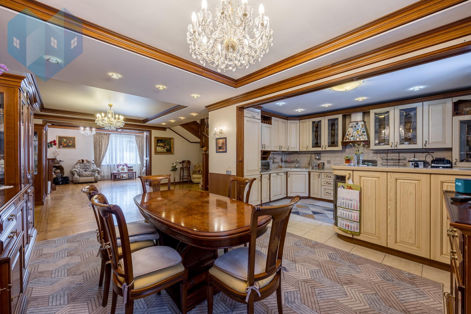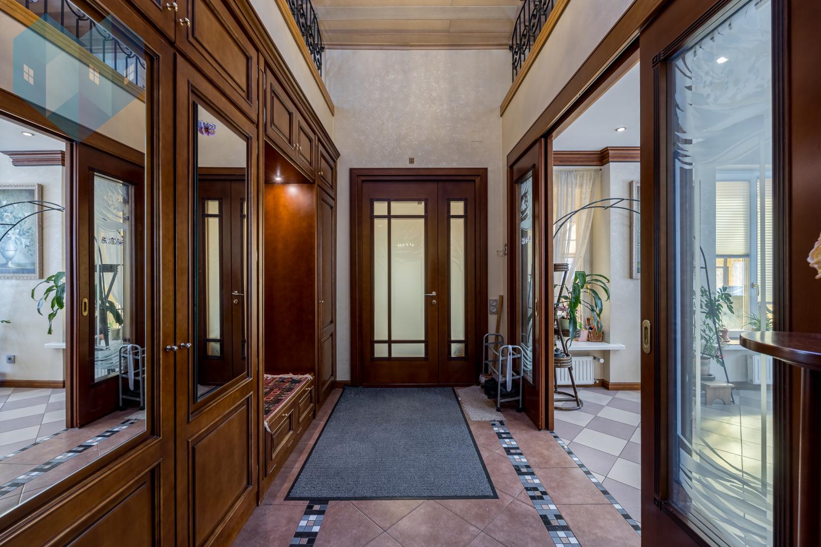 Во внутренней отделке дома использованы премиальные материалы: художественный паркет, венецианская штукатурка, тканевые обои, двери и мебель из массива.
