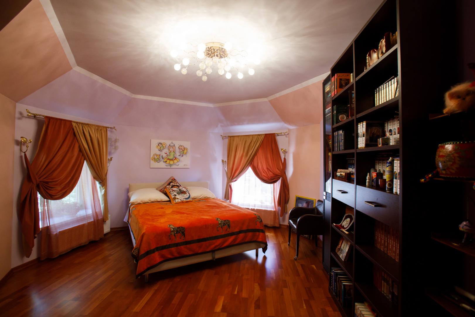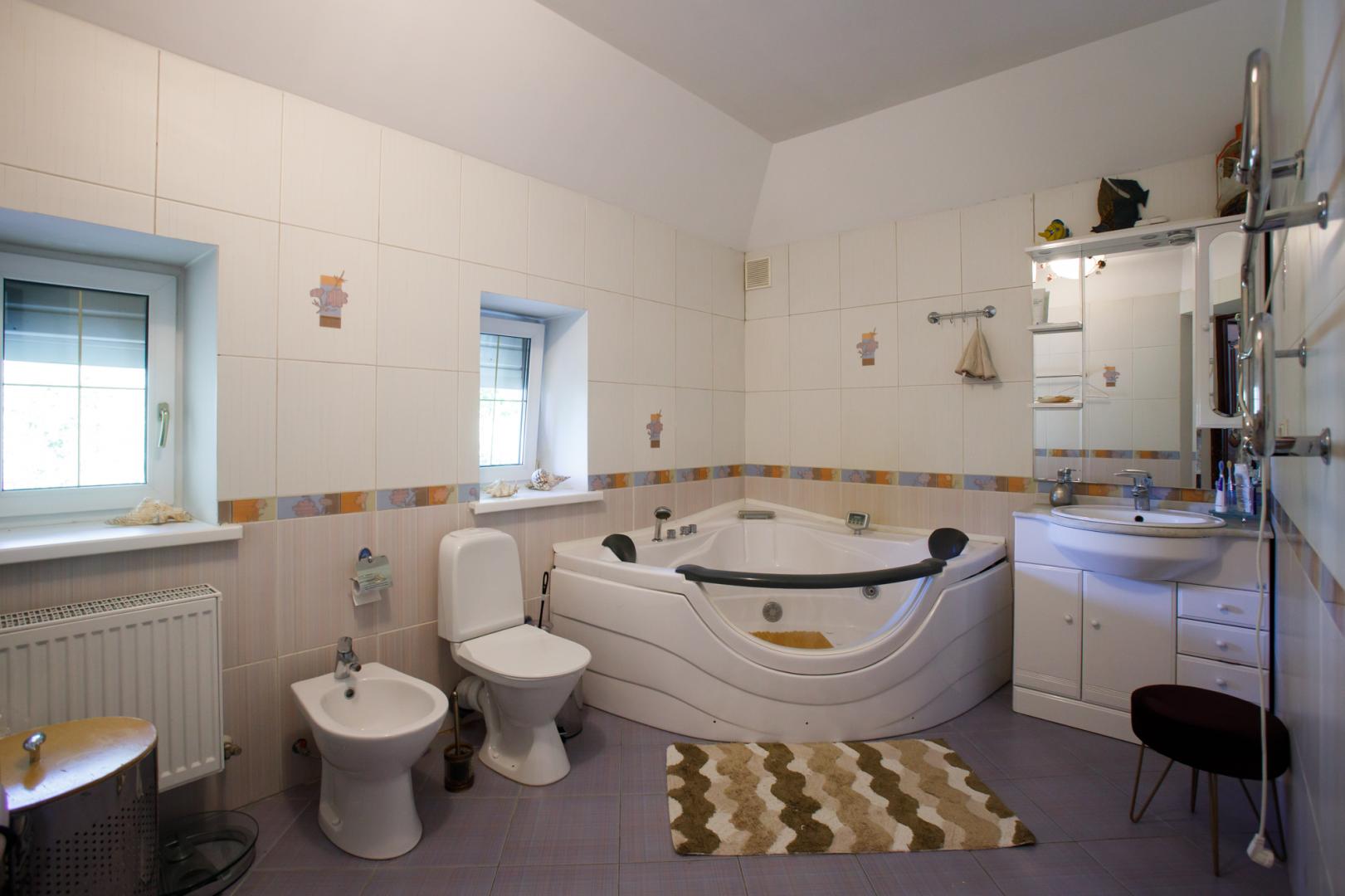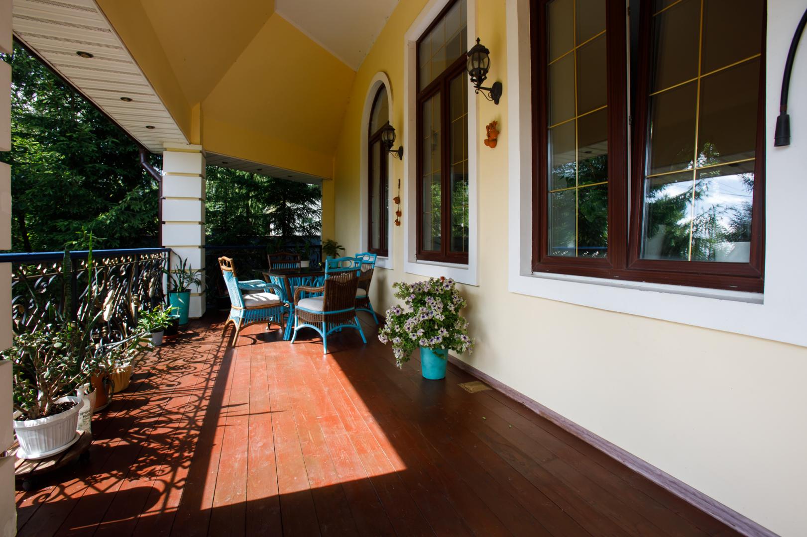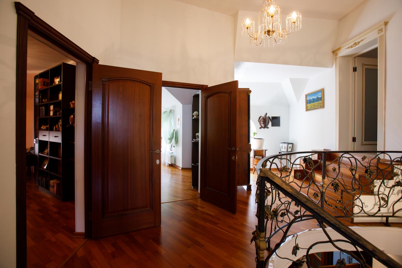 КОТТЕДЖ 2015 года постройки, двухуровневый 348.3 кв.м в классическом стиле с витражными онами – из добротного кирпича, отличная шумоизоляция стен (ширина 50 см), перекрытия железобетонные, фундамент бетонный, крыша металлочерепица, залита чаша под закрытый бассейн в доме. Летняя веранда с деревянным настилом под крышей, кованым ограждением и местом под барбекю. Натяжные потолки, пол дубовый паркет, окна тройной стеклопакет Rehau, стены под покраску. Функциональная планировка: подвал – котельная, прачечная, кладовые, первый этаж – гостиная с действующим камином, гостевой санузел, просторная кухня с эркером и панорамным остеклением во двор, огромный зал с выходом на террасу, второй этаж – три гостевых спальни, хозяйская спальня с гардеробной и ванной комнатой. В доме имеется вся мебель, техническое и сантехническое оборудование.