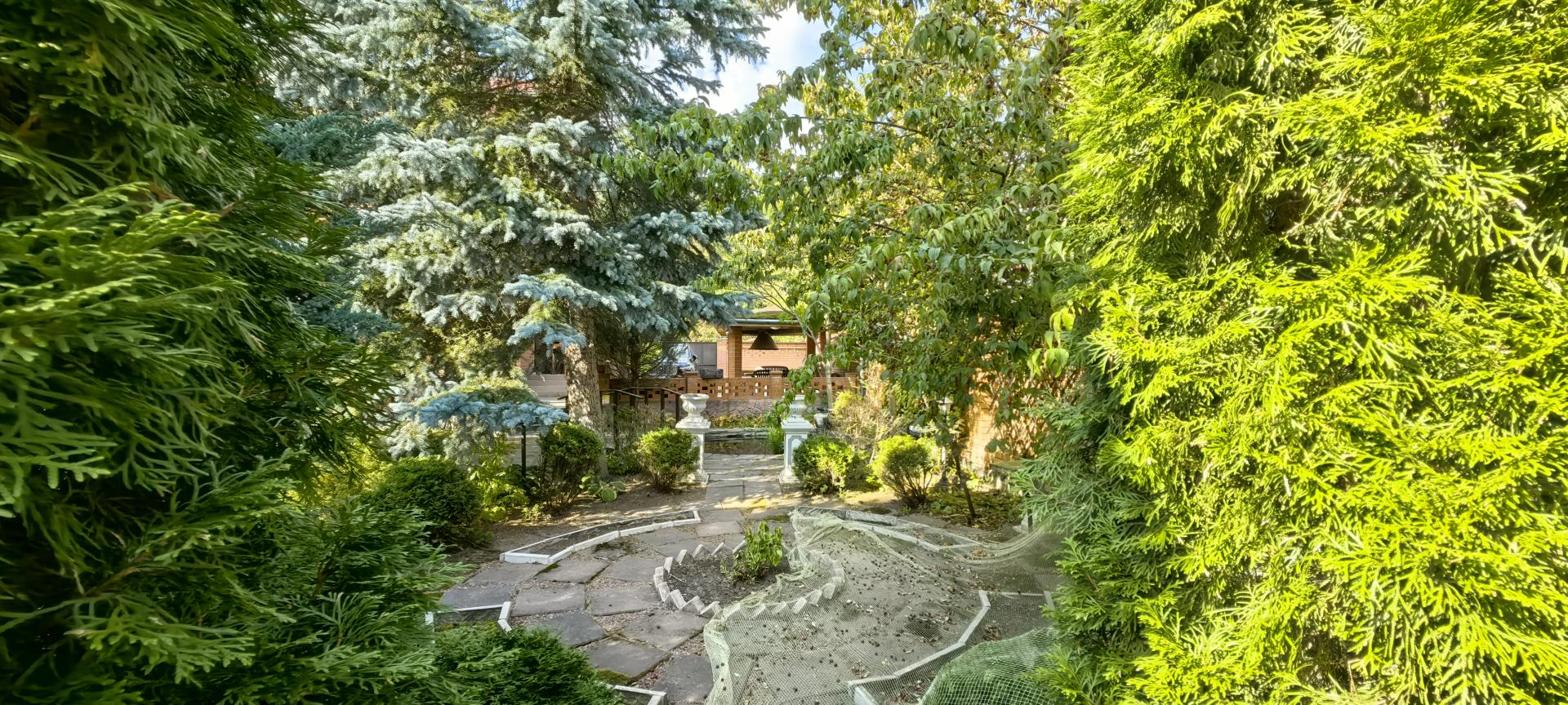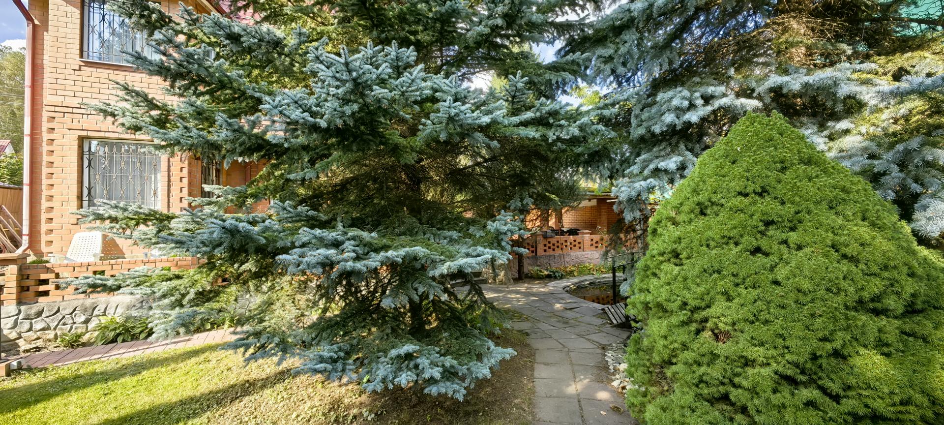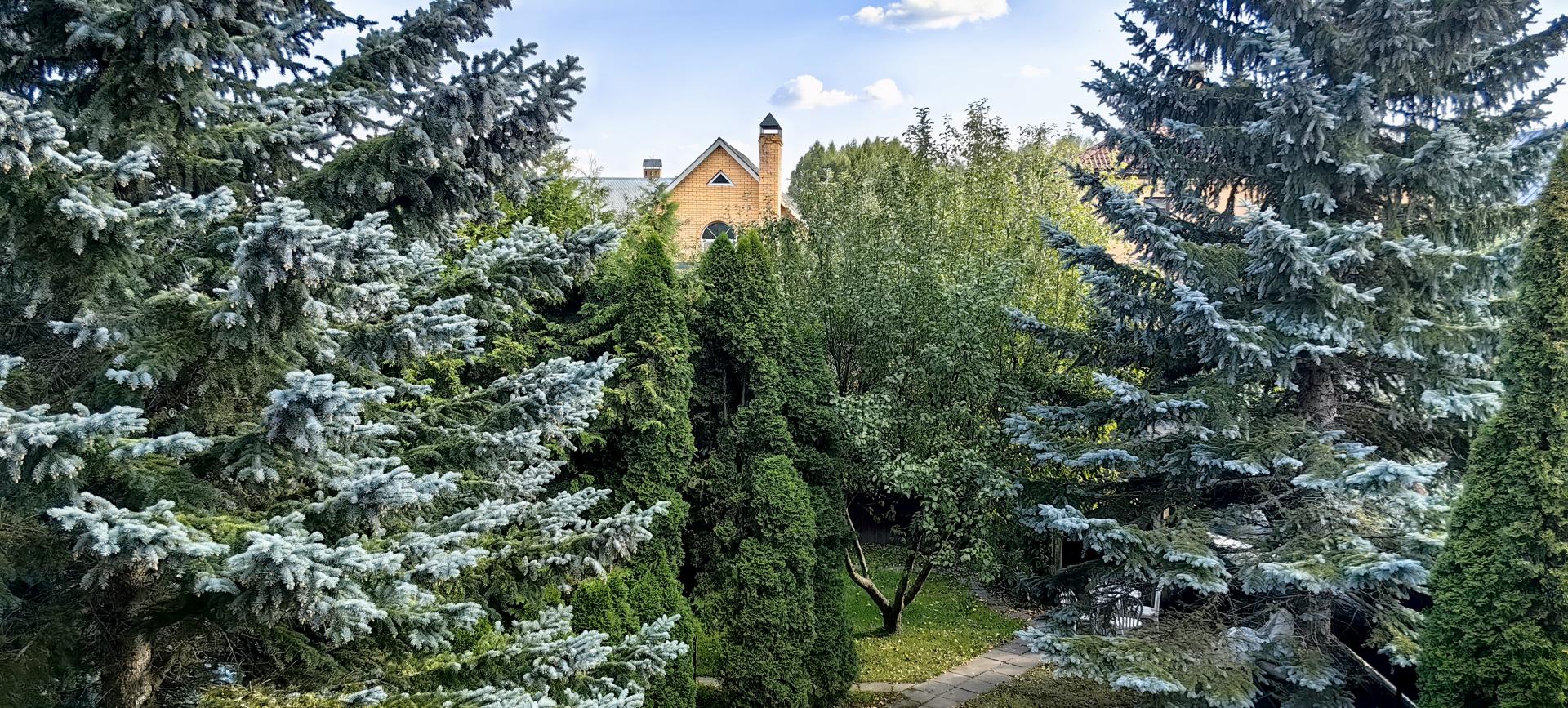 - голубые ели, плодоносящие деревья и кустарники.