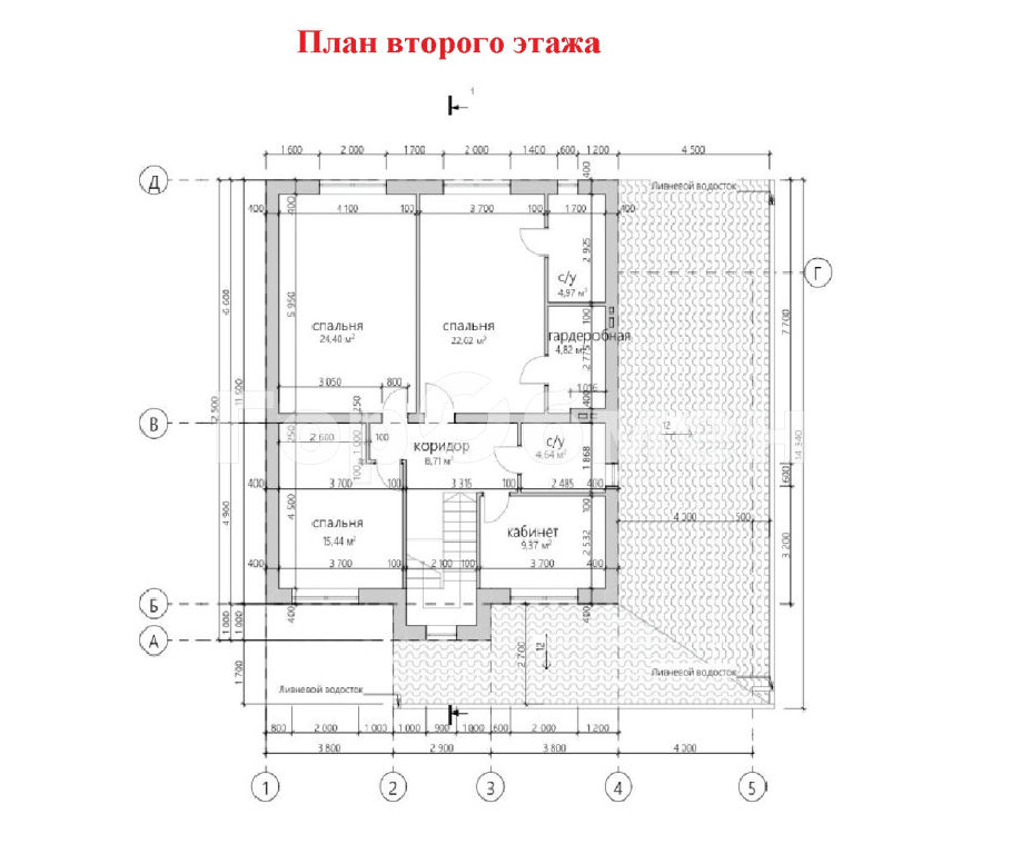 2 этаж: МАСТЕР-СПАЛЬНЯ 22 м2 с санузлом 5 м2 и гардеробной комнатой 5 м2, спальня 24 м2, спальня 15 м2, кабинет 10 м2, санузел 5 м2.