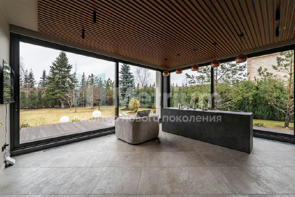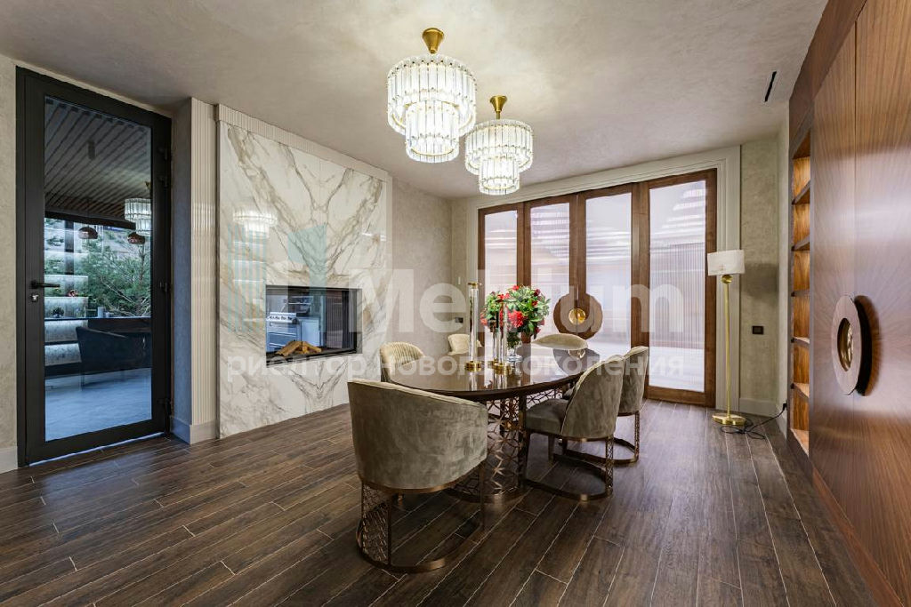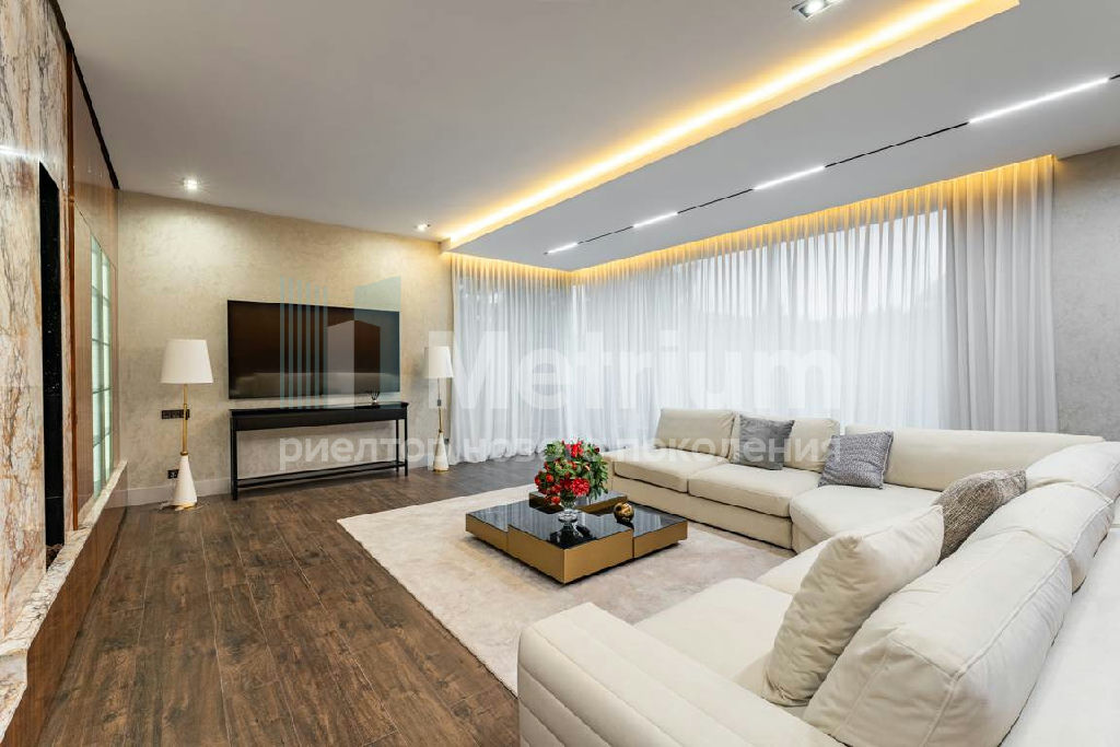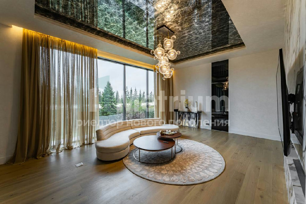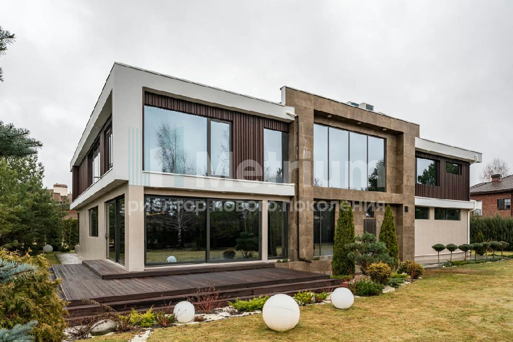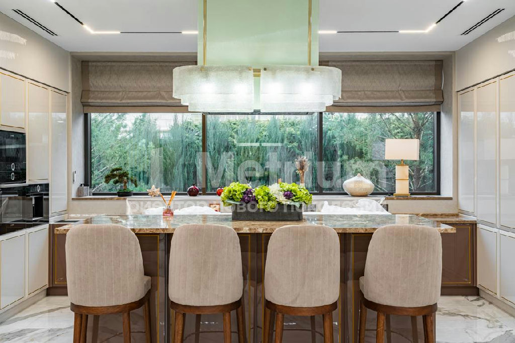 Дизайн выполнен в роскошных светлых теплых оттенках в совокупности с интересными дизайнерскими решениями. В доме 5 спален со своими с/у и гардеробными, роскошная зона барбекю с камином и прекрасным видом на участок. Уютная столовая соединена с зоной барбекю двухсторонним камином, новая итальянская кухня оснащена техникой Miele, просторная гостиная с окнами в пол и камином из оникса, полностью оборудованная гардеробная при входе, квартира для персонала с отдельным входом. Гараж на 4 машиноместа. Выполнен ландшафтный дизайн с освещением и дорожками, при отделке использовались самые современные и дорогие материалы, особое внимание уделено освещению и подсветке.