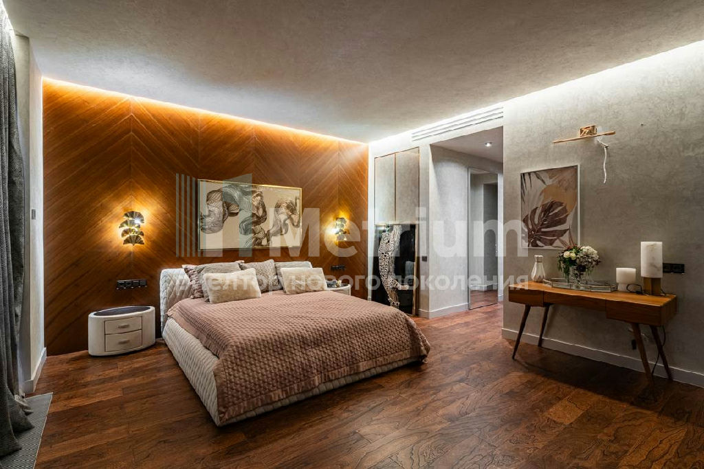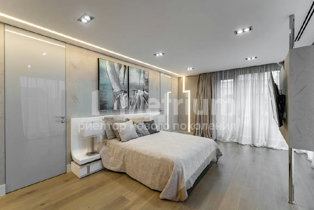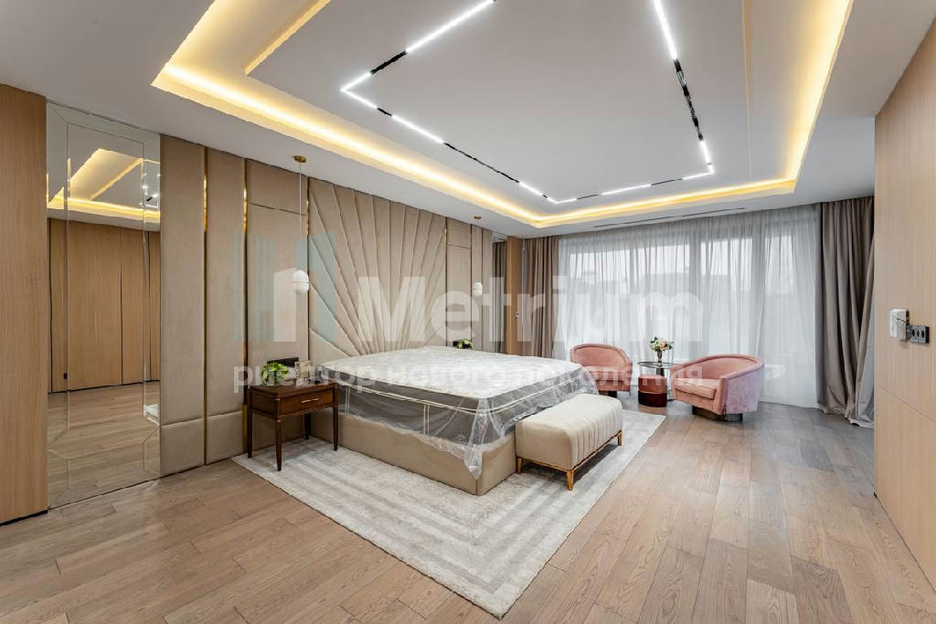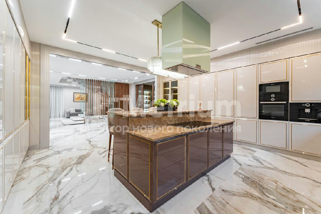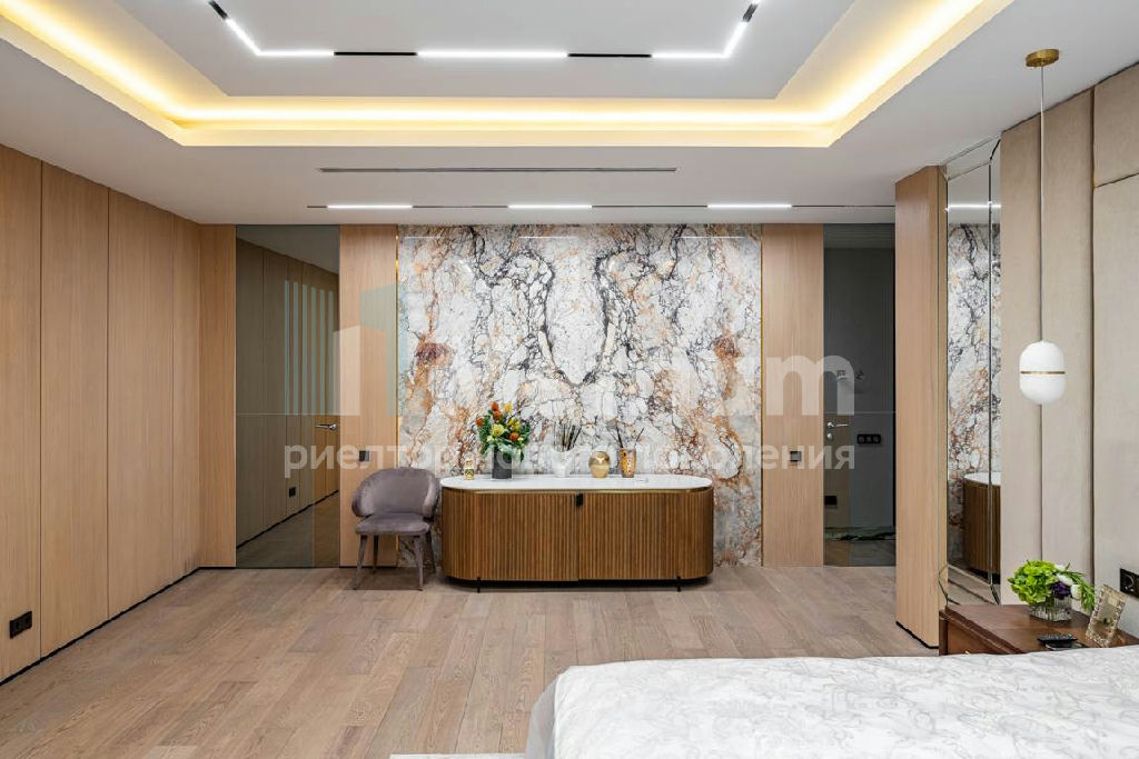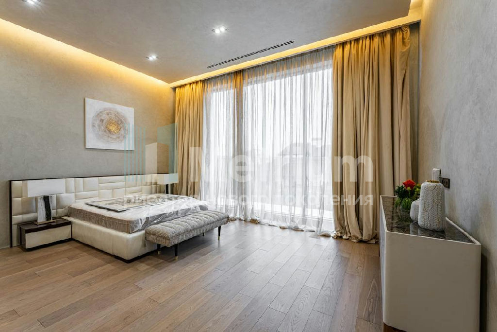 Дизайн выполнен в роскошных светлых теплых оттенках в совокупности с интересными дизайнерскими решениями. В доме 5 спален со своими с/у и гардеробными, роскошная зона барбекю с камином и прекрасным видом на участок. Уютная столовая соединена с зоной барбекю двухсторонним камином, новая итальянская кухня оснащена техникой Miele, просторная гостиная с окнами в пол и камином из оникса, полностью оборудованная гардеробная при входе, квартира для персонала с отдельным входом. Гараж на 4 машиноместа. Выполнен ландшафтный дизайн с освещением и дорожками, при отделке использовались самые современные и дорогие материалы, особое внимание уделено освещению и подсветке.
