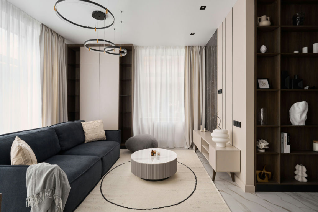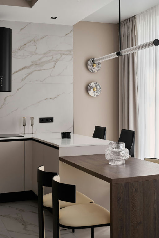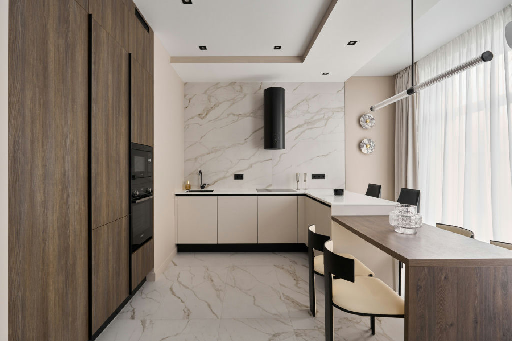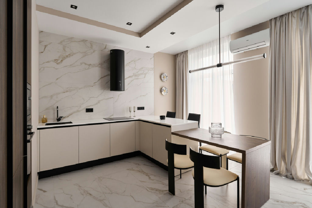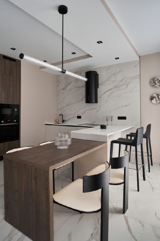 Кухня-гостиная с встроенной техникой и дизайнерской мебелью