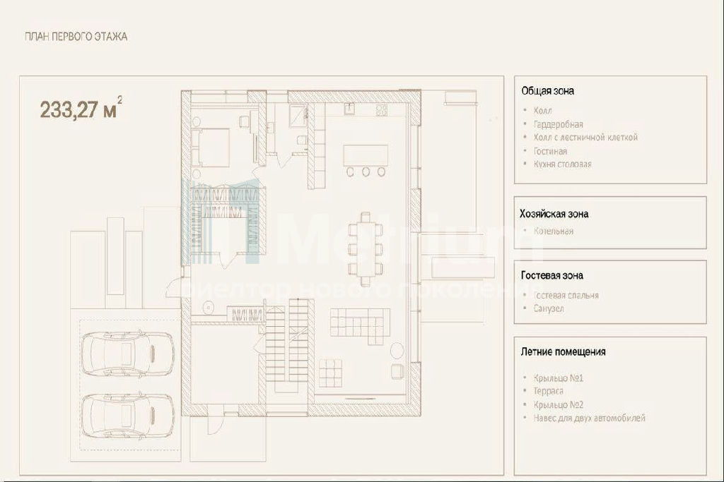 из керамогранита. Для комфорта под него уложили систему теплого пола. Модульный диван бренда BoConcept и текстиль выбрали в более светлых песочно-бежевых оттенках. Планировкой предусмотрены просторная кухня-гостиная, 4 спальни и навес для 2х автомобилей.