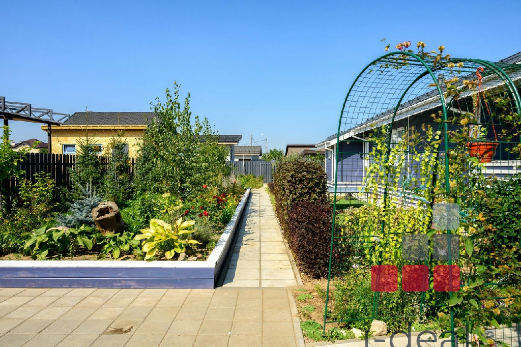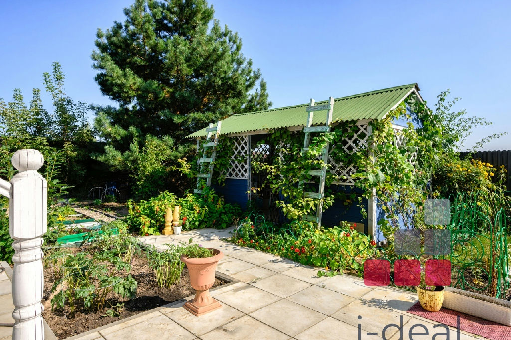 Участок правильной формы, облагорожен и разделен на зоны: парадная с цветниками и вымощенной парковкой, хозяйственная (мастерская-сарай со столярным верстаком), ландшафтная - садовая, лесная, зона отдыха с беседкой, игровая зона.