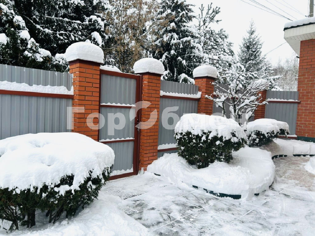 Металлический забор. Автоматические ворота для въезда в гараж. Двор и садовые дорожки уложены мягкой плиткой.