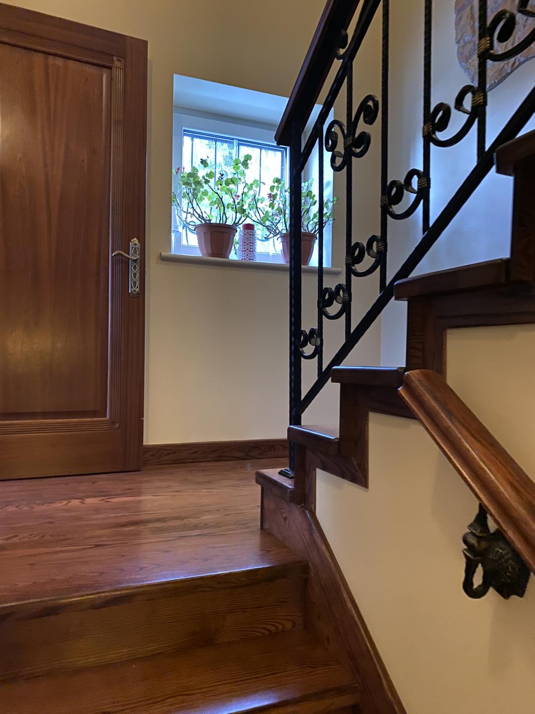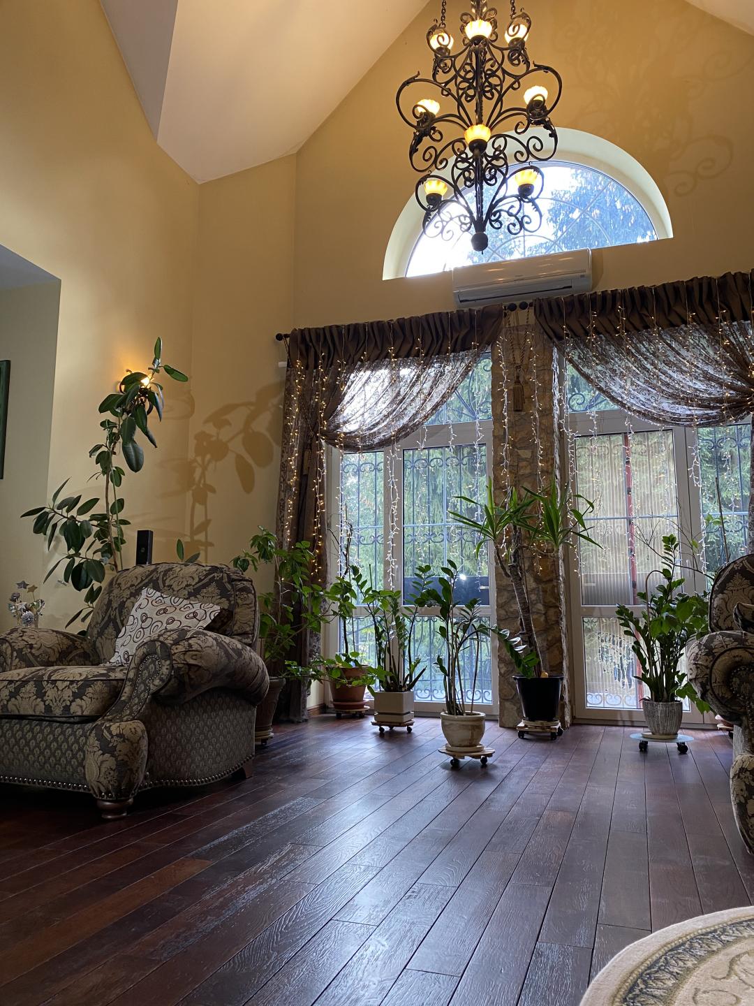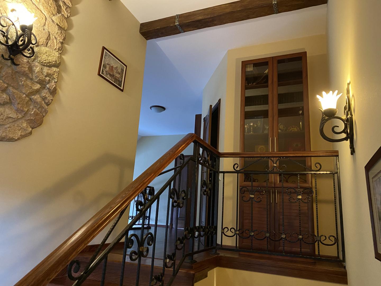 Между первым и вторым этажами – пространство «второго света» с дизайнерской (выполнено по инд.проекту) кованой люстрой и бра.