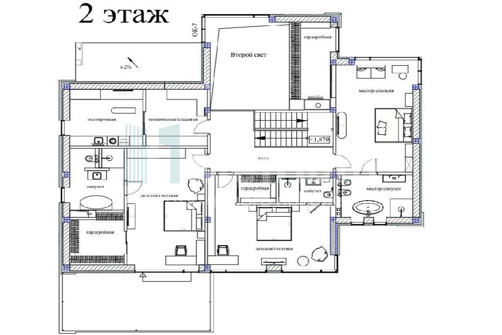 ID 13786 Новый дом бизнес-класса (на 4 спальни, в мастер-спальне 2 гардеробные комнаты + сан. узел с панорамным остеклением) площадью 616 кв.м(монолит/кирпич) на лесном земельном участке площадью 13 сот. Крытый гараж с панорамно-секционными воротами на 2 машино-места и террасой над ним. Центральная система вентиляции и кондиционирования. Высота потолков 3,3м. Центральные коммуникации. Теплые полы на 1 и 2-эт. Технологичная система газового отопления, с функцией дистанционного контроля и мониторинга. Система очистки воды. Энергосберегающее панорамное остекление, препятствует тепло-потерям в зимний период времени и попаданию ультра-фиолетового излучения, в летний период. Фасадное освещение в трендовой стилистике. Готовность декабрь 2024 г. под отделку.