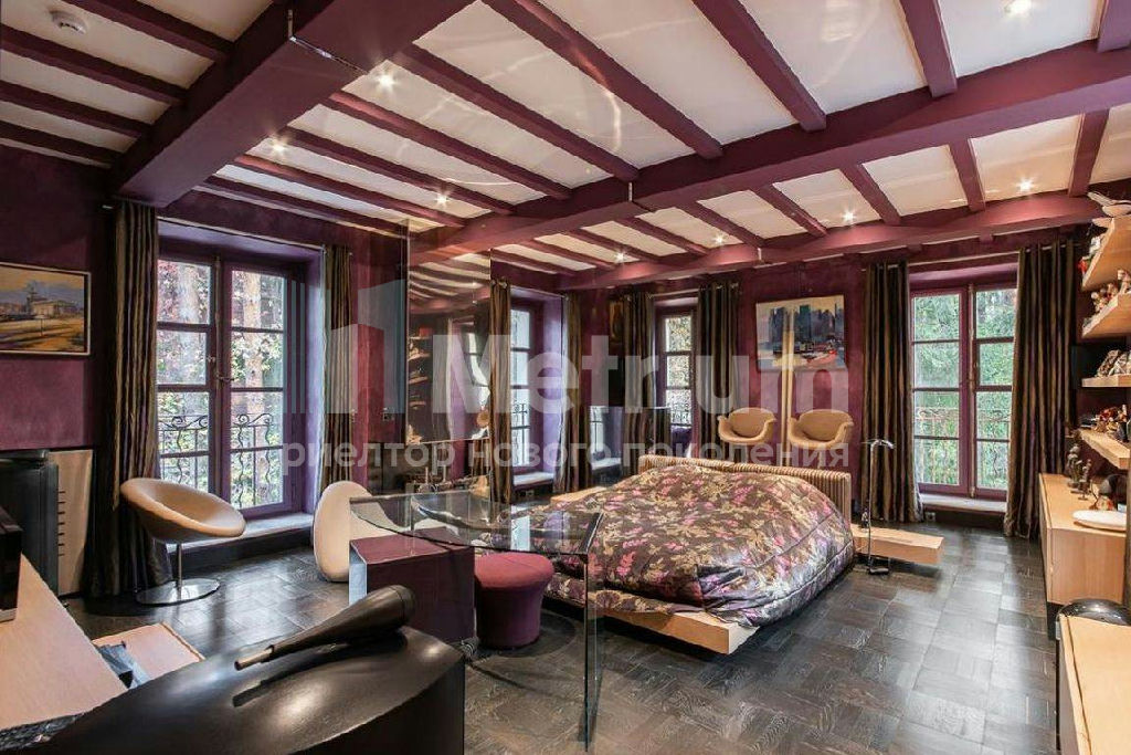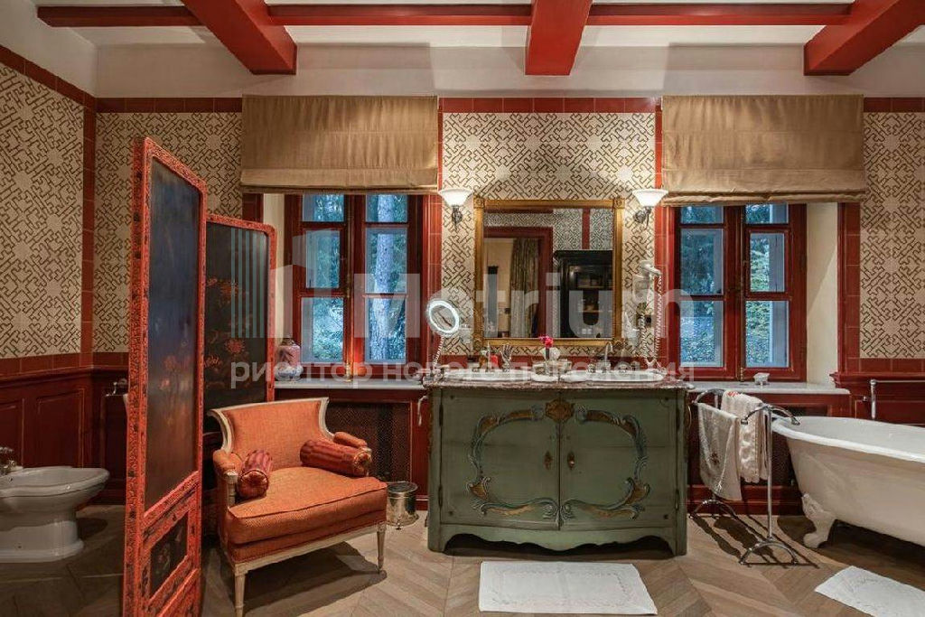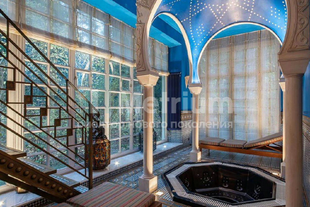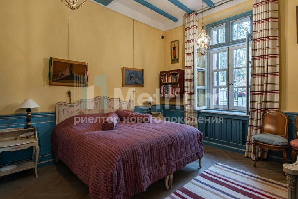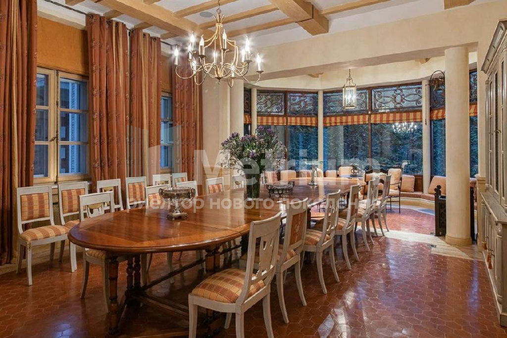 ID 13133 Семейная резиденция на лесном участке в элитном поселке Сосновый бор на Николиной горе. Внутреннее пространство дома включает 6 спален с собственными ванными и гардеробными (в мастер-спальне и одной из детских предусмотрены камины), просторную гостиную со вторым светом, столовую с выходом на террасу, спа-зону с хаммамом и сауной, домашний кинотеатр, тренажерный зал, барную комнату. Интерьер оформлен в стиле прованс по проекту именитого французского декоратора Alain Gosselin с применением натуральных материалов, выполненной на заказ мебели и дизайнерских светильником. На прилегающем участке растут вековые сосны, асположена баня, предусмотрен теннисный корт, спортивная площадка, футбольное поле, летний кинотеатр и беседка с кухней.