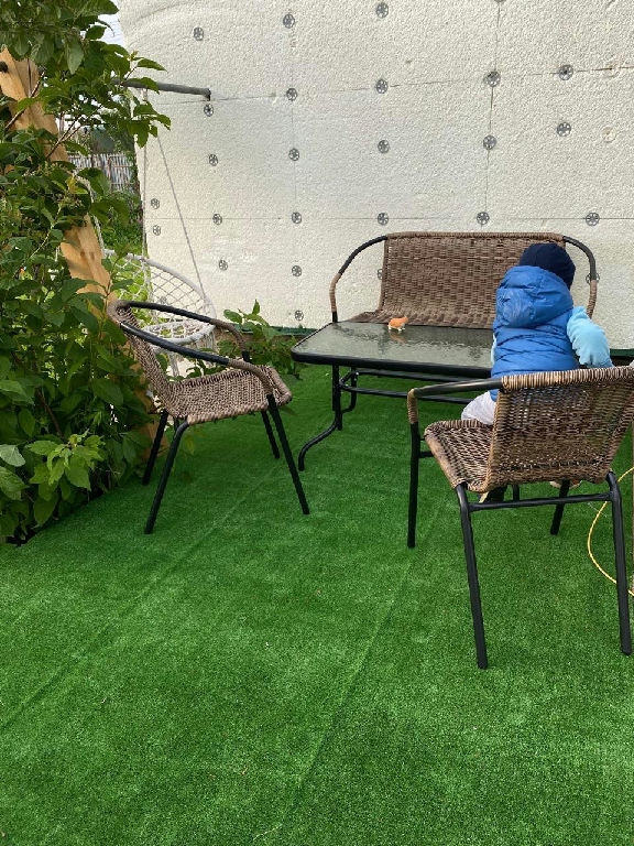 Участок огорожен, сделан навес для авто, летняя терраса, детский уголок.