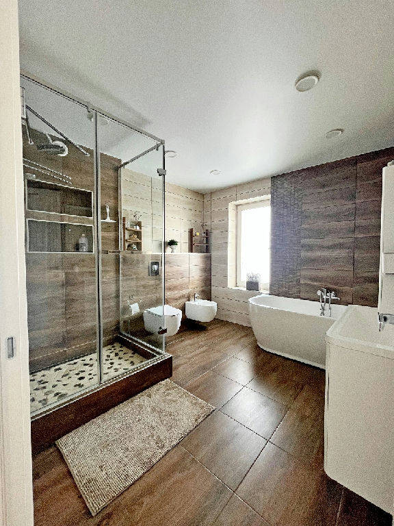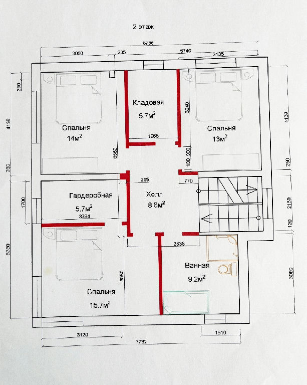 2 этаж: мастер - спальня со своей гардеробной, 2 спальни, гардеробная, санузел с душевой кабиной и ванной.