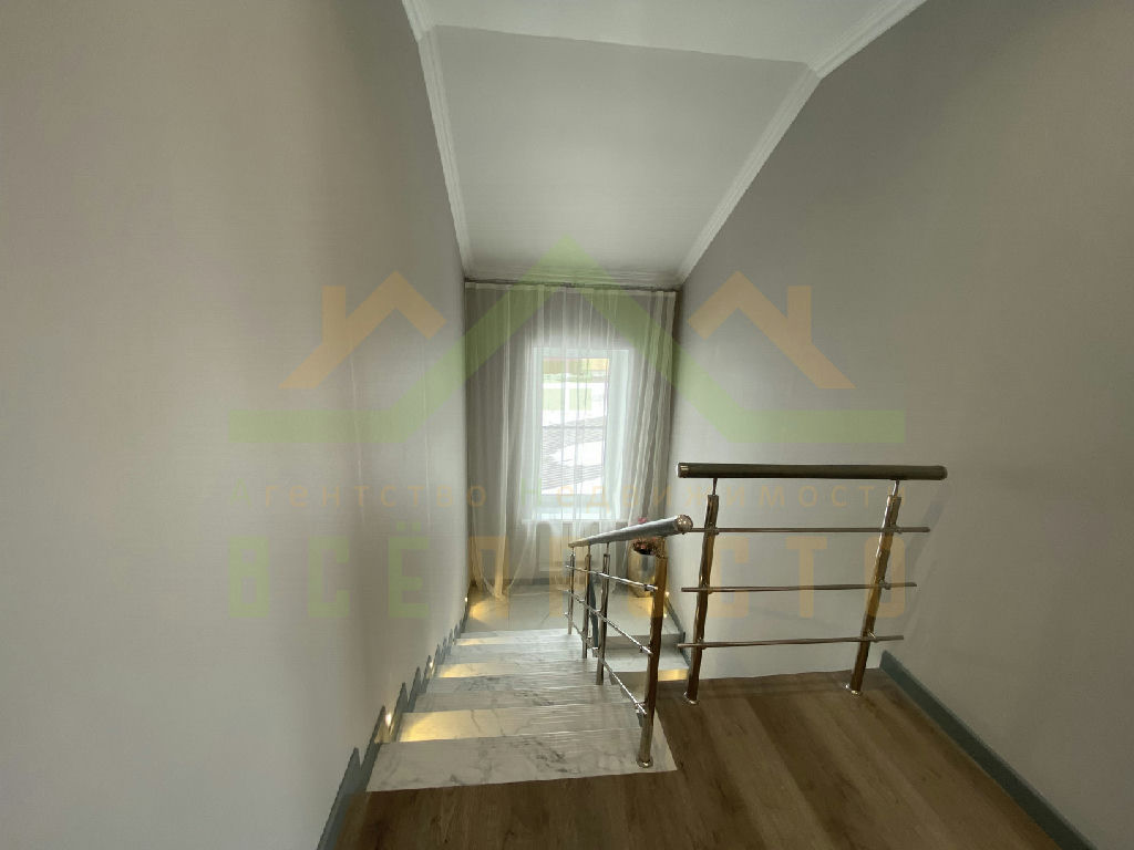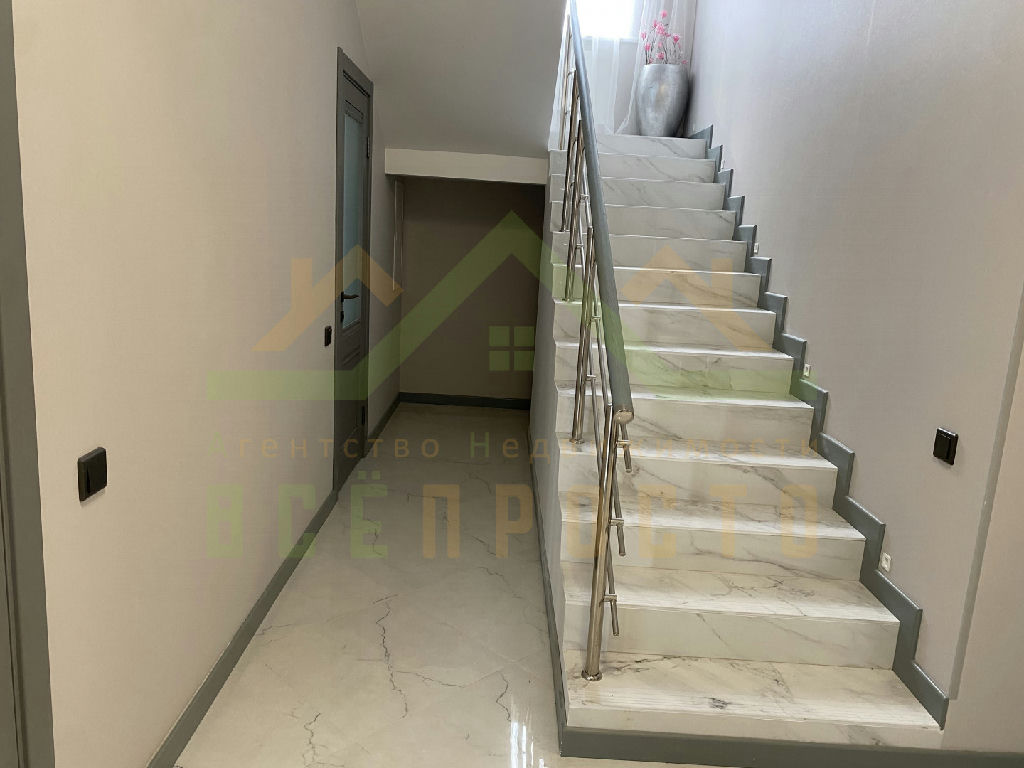 Между этажами красивая современная лестница с металическими перилами ,дубовыми поручнями и подсветкой.