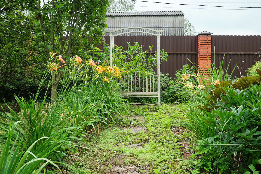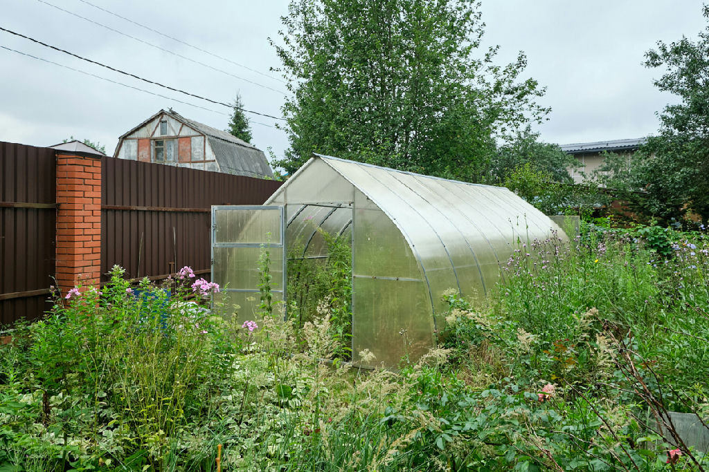 На участке газон, плодовые деревья, туи, теплица, отдельные удобренные грядки. Мангальная зона. Много плодоносящих кустов.