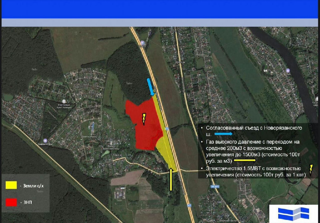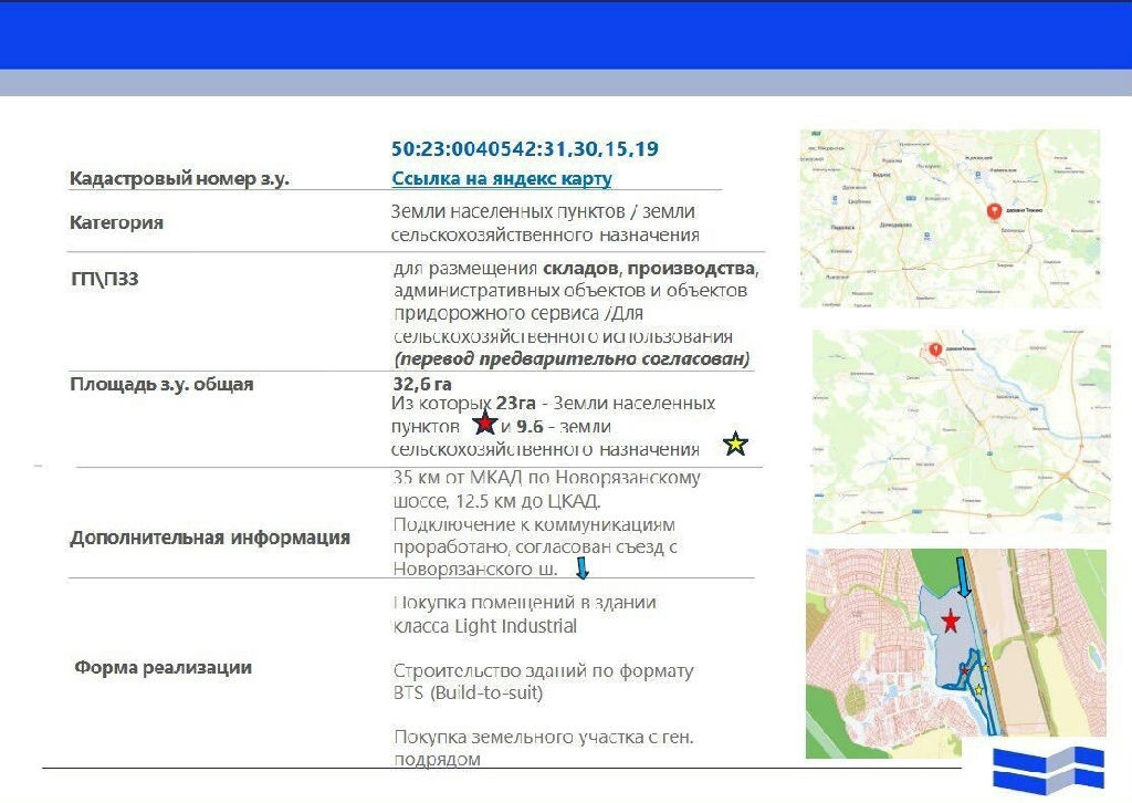 Код объекта: 2067449.Земельный участок 32,6 га на Новорязанском шоссе: инвестиционная возможность для создания логистического хаба Предлагаем к приобретению перспективный земельный актив площадью 32,6 га для строительства складского комплекса. Участок расположен в Московской области, в районе деревни Тяжино, локация обладает высоким потенциалом для развития логистической инфраструктуры.Локация и транспортная доступность Объект находится в 35 км от МКАД по Новорязанскому шоссе ключевому транспортному коридору юговосточного направления. Преимущества местоположения:близость к ЦКАД всего 12,5 км;согласованный съезд с Новорязанского шоссе, обеспечивающий удобный доступ для грузового и легкового транспорта;развитая транспортная сеть, позволяющая оптимизировать логистические маршруты. Характеристики земельного участка Общая площадь массива 32,6 га, структура земельного фонда:23 га земли населённых пунктов. Согласно градостроительному плану и правилам землепользования и застройки (ГП/ПЗЗ), участки предназначены для:размещения складских объектов;организации производственных площадок;строительства административных зданий;создания объектов придорожного сервиса.9,6 га земли сельскохозяйственного назначения. Перевод категории предварительно согласован, что расширяет возможности использования территории. Кадастровые номера: 50:23:0040542:31, 30, 15, 19.Инженерная инфраструктура и разрешительная документация Участок обеспечен подключениями к основным инженерным сетям с возможностью масштабирования:Электричество: получено техприсоединение на 1,8 МВт, предусмотрена опция увеличения мощности.Газ: согласовано техприсоединение на 200 м3/час, с перспективой расширения до 1500 м3/час. Полученные и согласованные документы:технические условия (ТУ) на примыкание;проект организации дорожного движения (ПОДД);градостроительный план земельного участка (ГПЗУ);топографическая съёмка территории. Условия сделки Формат предложения прямая продажа земельных участков. Это позволяет минимизировать сроки реализации проекта и оперативно приступить к строительству.Инвестируйте в перспективную локацию с готовой инфраструктурой и всеми необходимыми согласованиями!