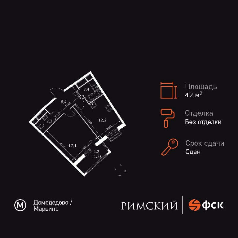 Общая: 42,7 м2