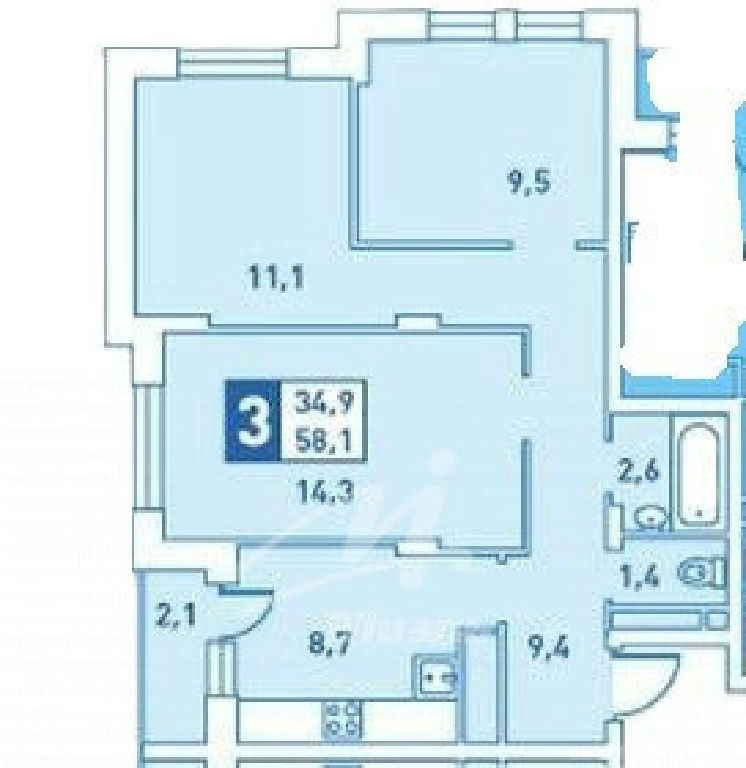 Комнаты: 14.3 11.1 9.5 м2