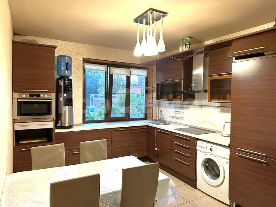 Квартира полностью обустроена для комфортного проживания. На кухне: кухонный гарнитур под единой столешницей со встроенной бытовой техникой, обеденная зона. В коридоре: шкафы-купе, зона отдыха с удобным диваном и телевизором. В первой комнате: двуспальная кровать, диван, рабочая зона. Во второй комнате: удобный двуспальный диван и рабочая зона. В детской комнате: функциональная детская с двуспальной кроватью. Санузел совмещен, в плитке до потолка. Окна выходят во двор.