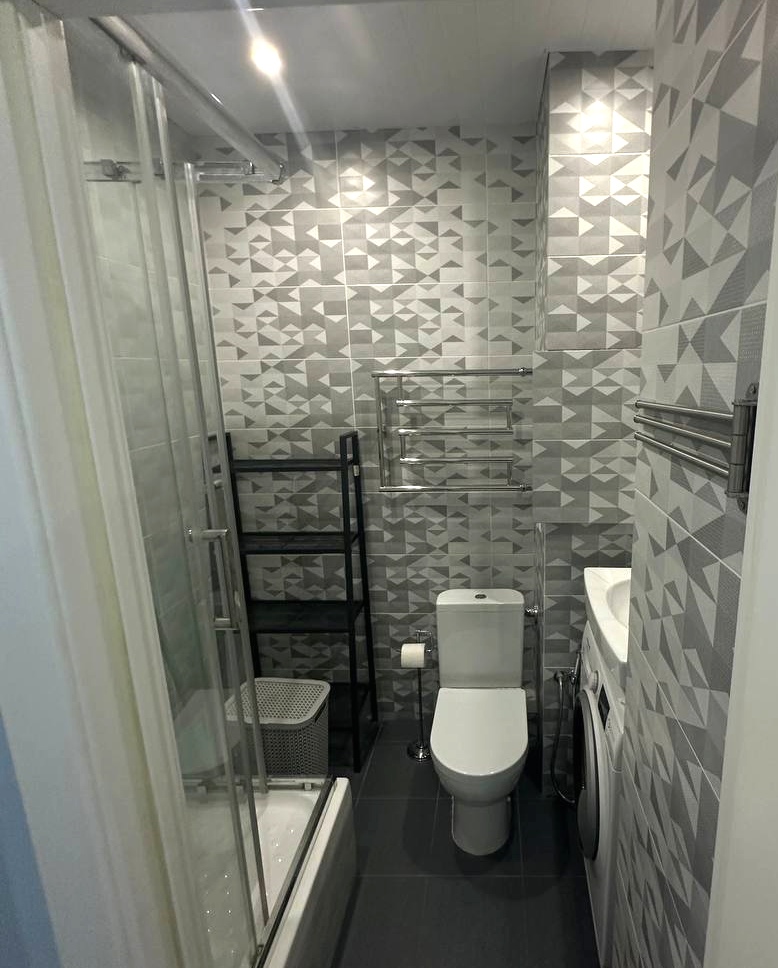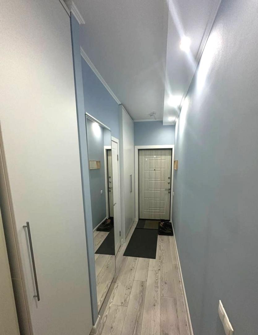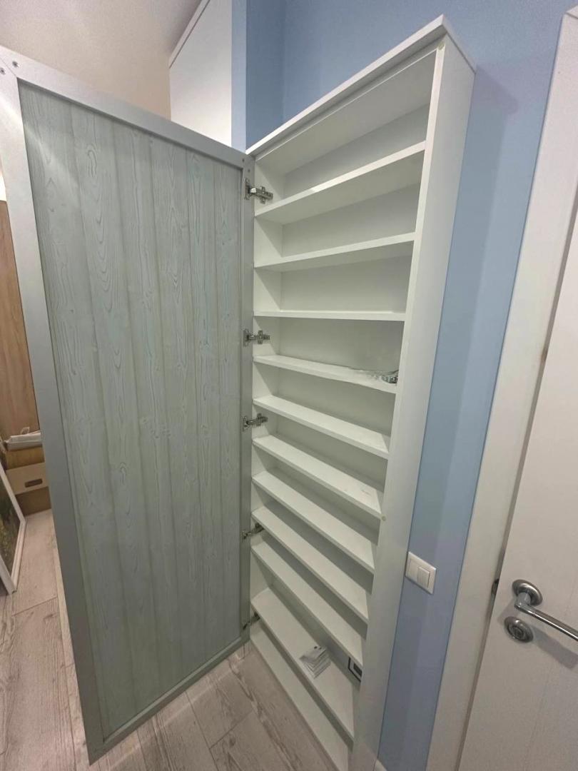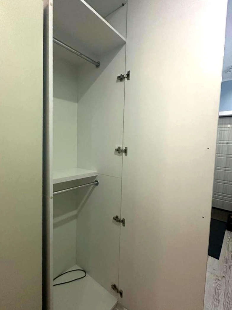 Пространство организовано максимально рационально: панорамное остекление на балконе наполняет квартиру светом, в зоне кухни уже установлена техника Hansa, а мебель включает удобную систему с откидным матрасом Olisys, диван-кровать, буфет и гостиную-стенку. В ванной — тёплый пол, гигиенический душ, стиральная машина и полотенцесушитель. В холле размещены встроенные шкафы: купе, зеркальный и компактный для мелочей.