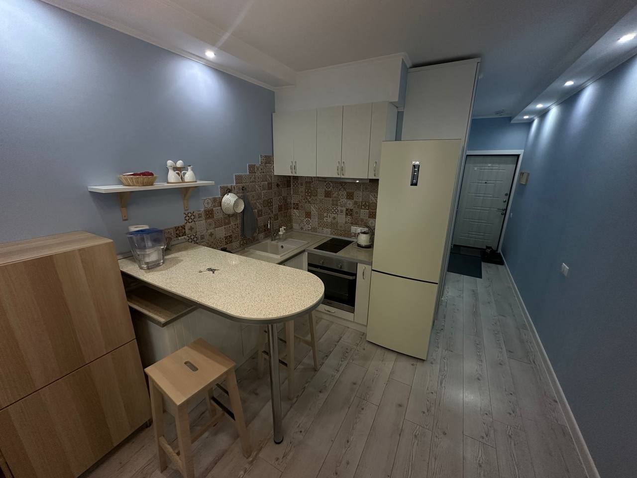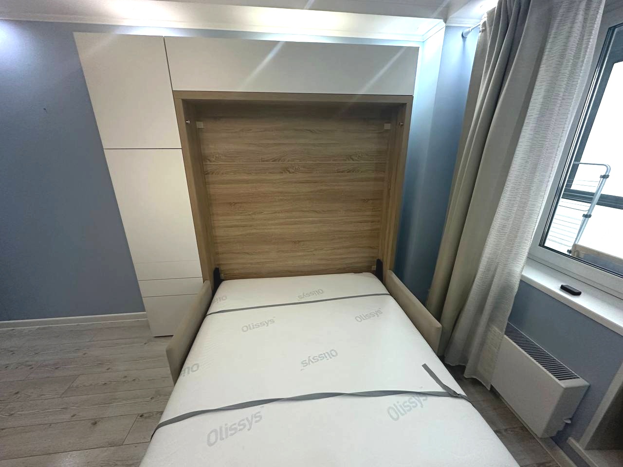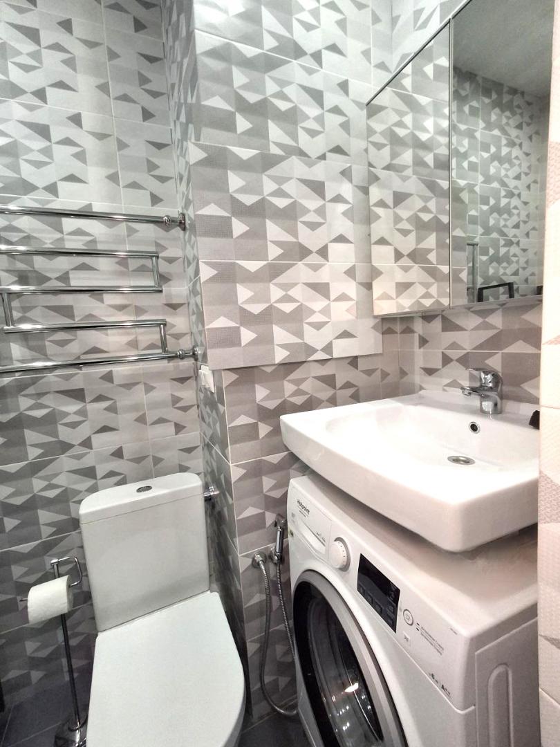 Пространство организовано максимально рационально: панорамное остекление на балконе наполняет квартиру светом, в зоне кухни уже установлена техника Hansa, а мебель включает удобную систему с откидным матрасом Olisys, диван-кровать, буфет и гостиную-стенку. В ванной — тёплый пол, гигиенический душ, стиральная машина и полотенцесушитель. В холле размещены встроенные шкафы: купе, зеркальный и компактный для мелочей.