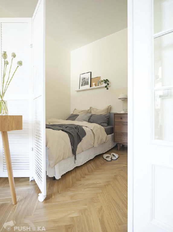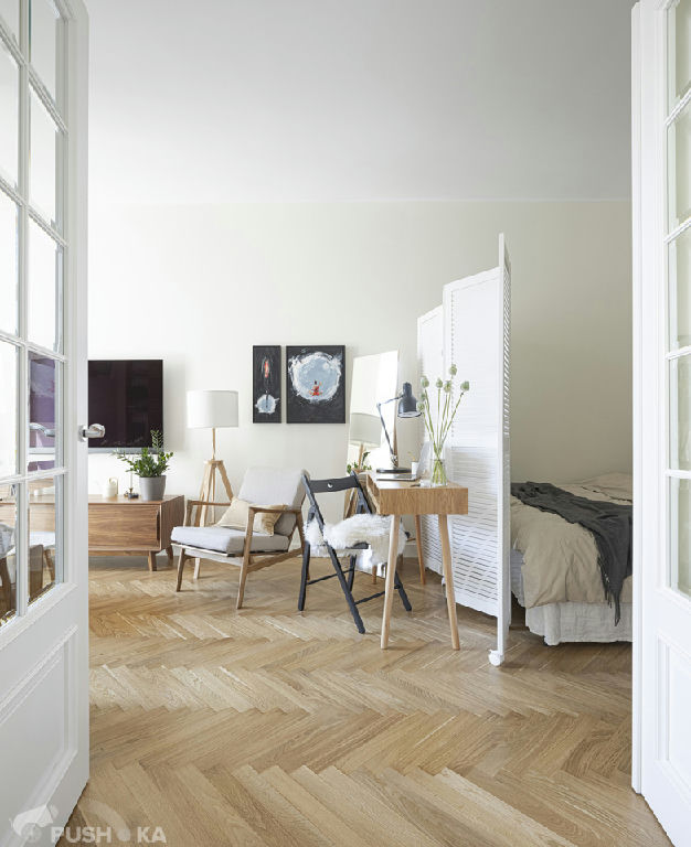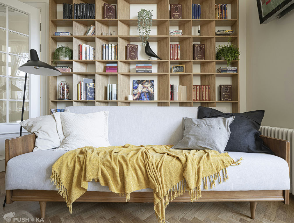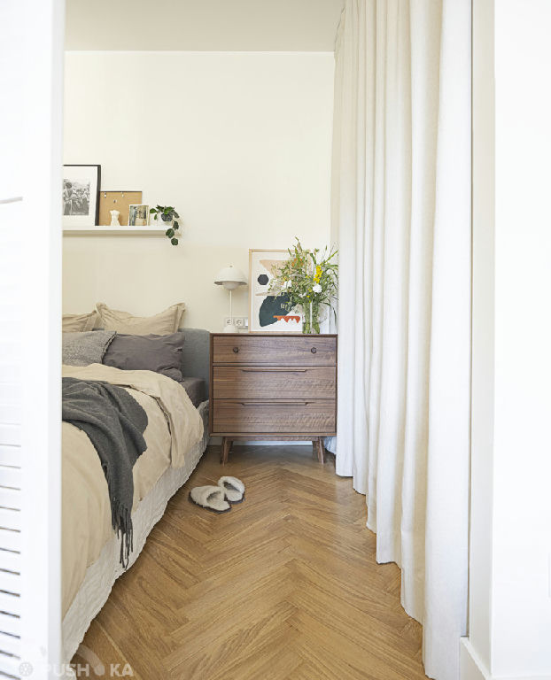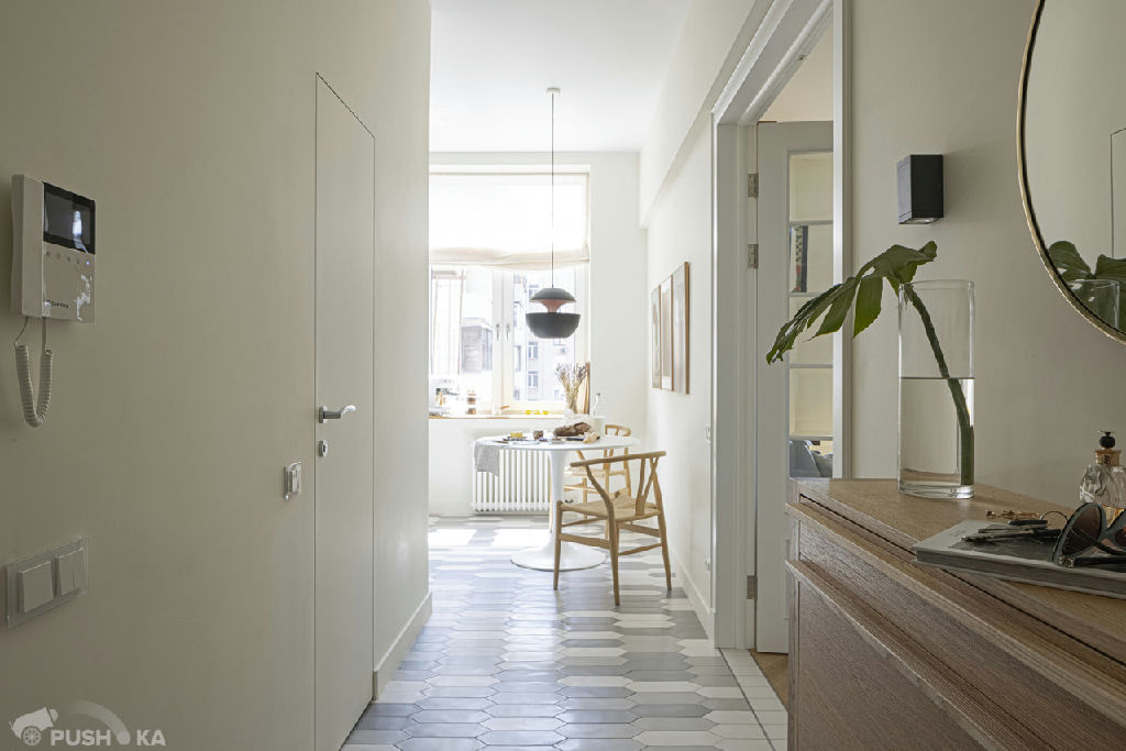 Светлая однокомнатная квартира с авторским ремонтом в сталинском доме. Интерьер выполнен в стиле mid-century modern.