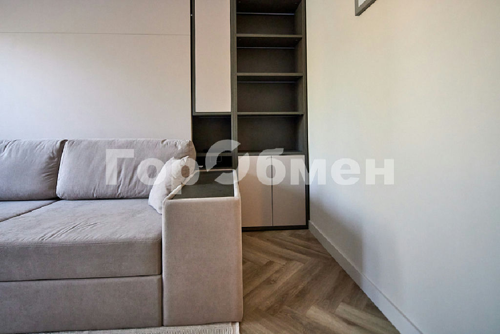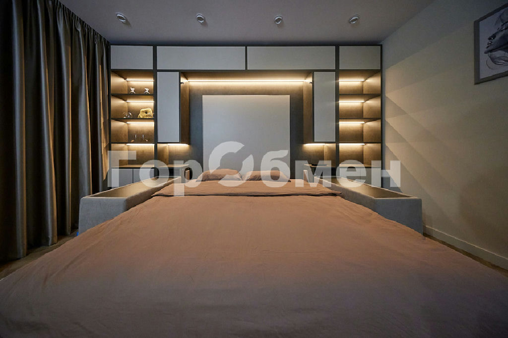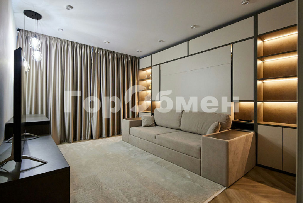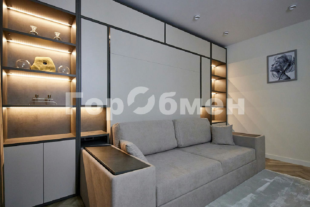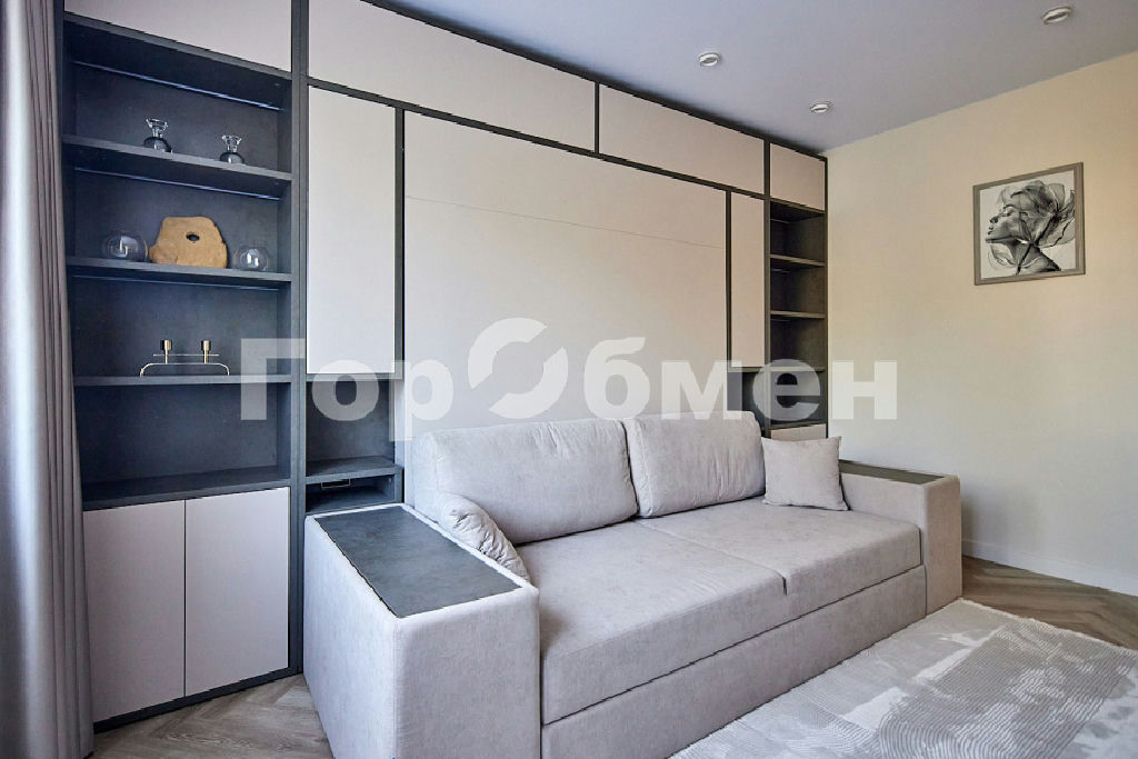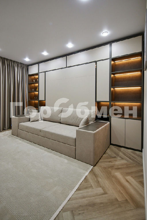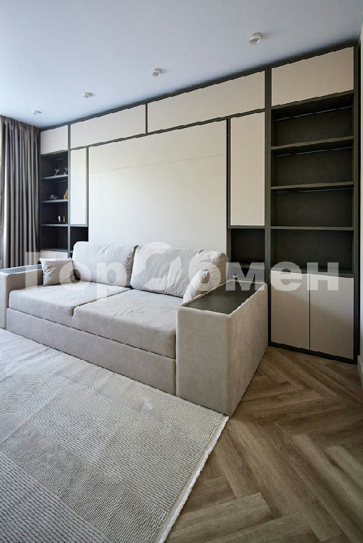 Мебель в комнате трансформер фирмы OLISSIS. Удобный диван и откидная полноценная кровать, размером 180х200мм с ортопедическим основанием и ортопедическим матрасом.