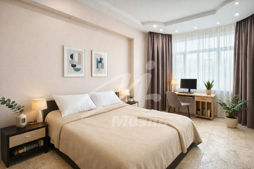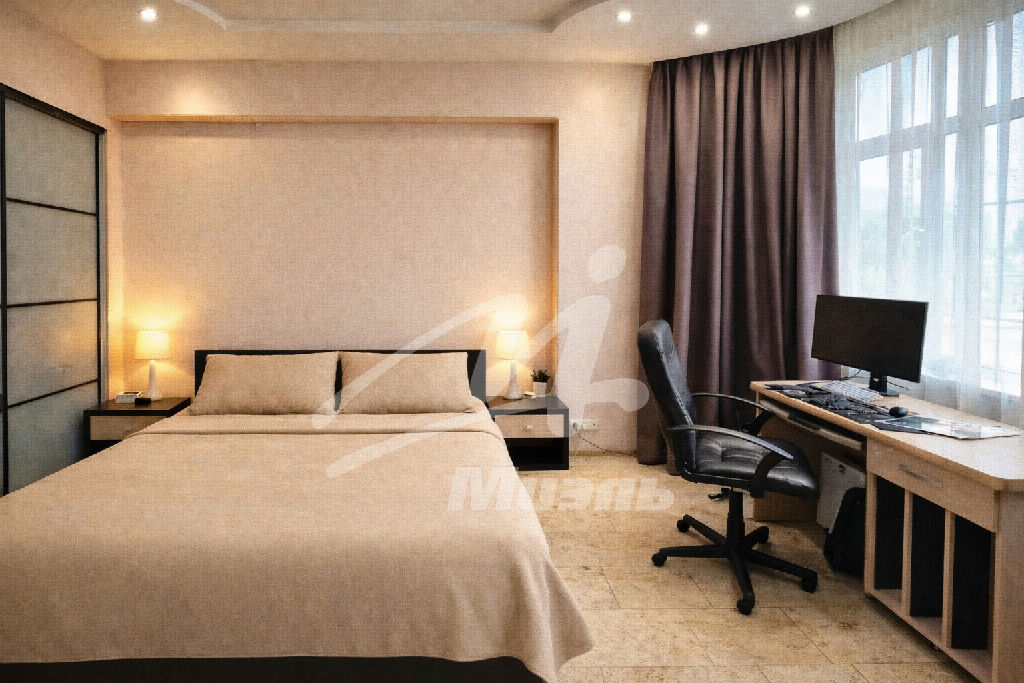 Спальня (25 м2): Светлая комната с кондиционером и выверенными световыми и цветовыми акцентами.