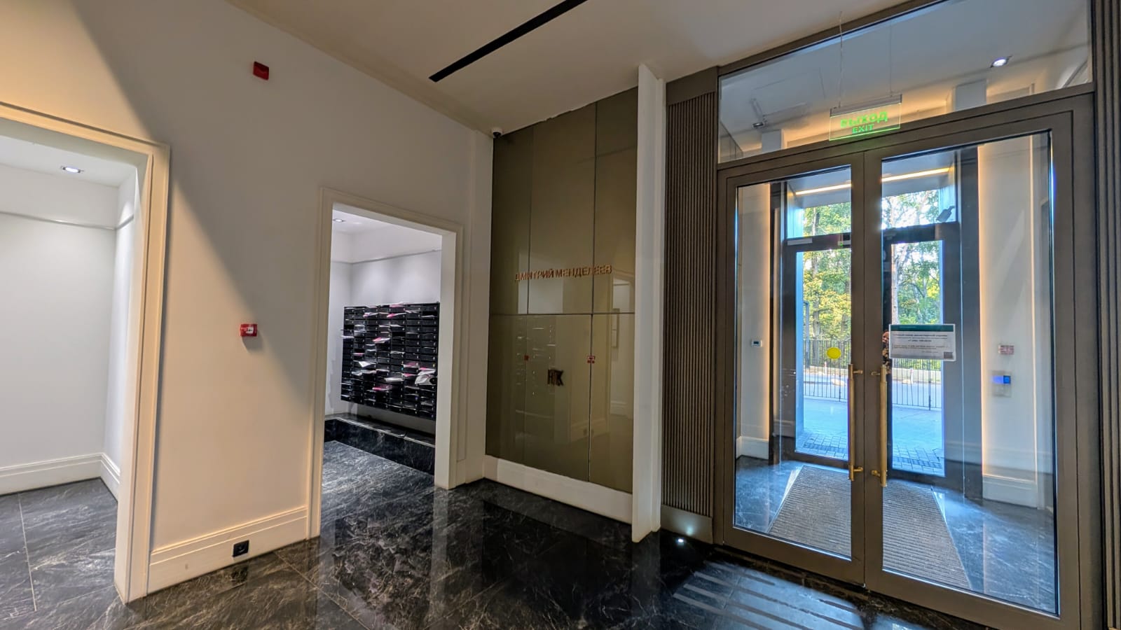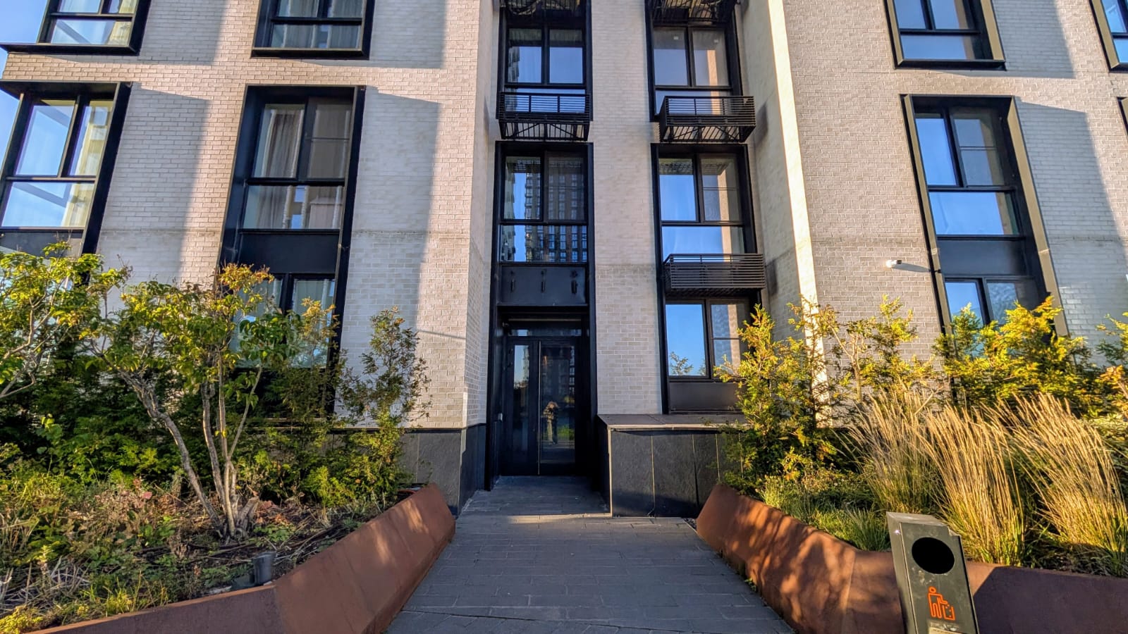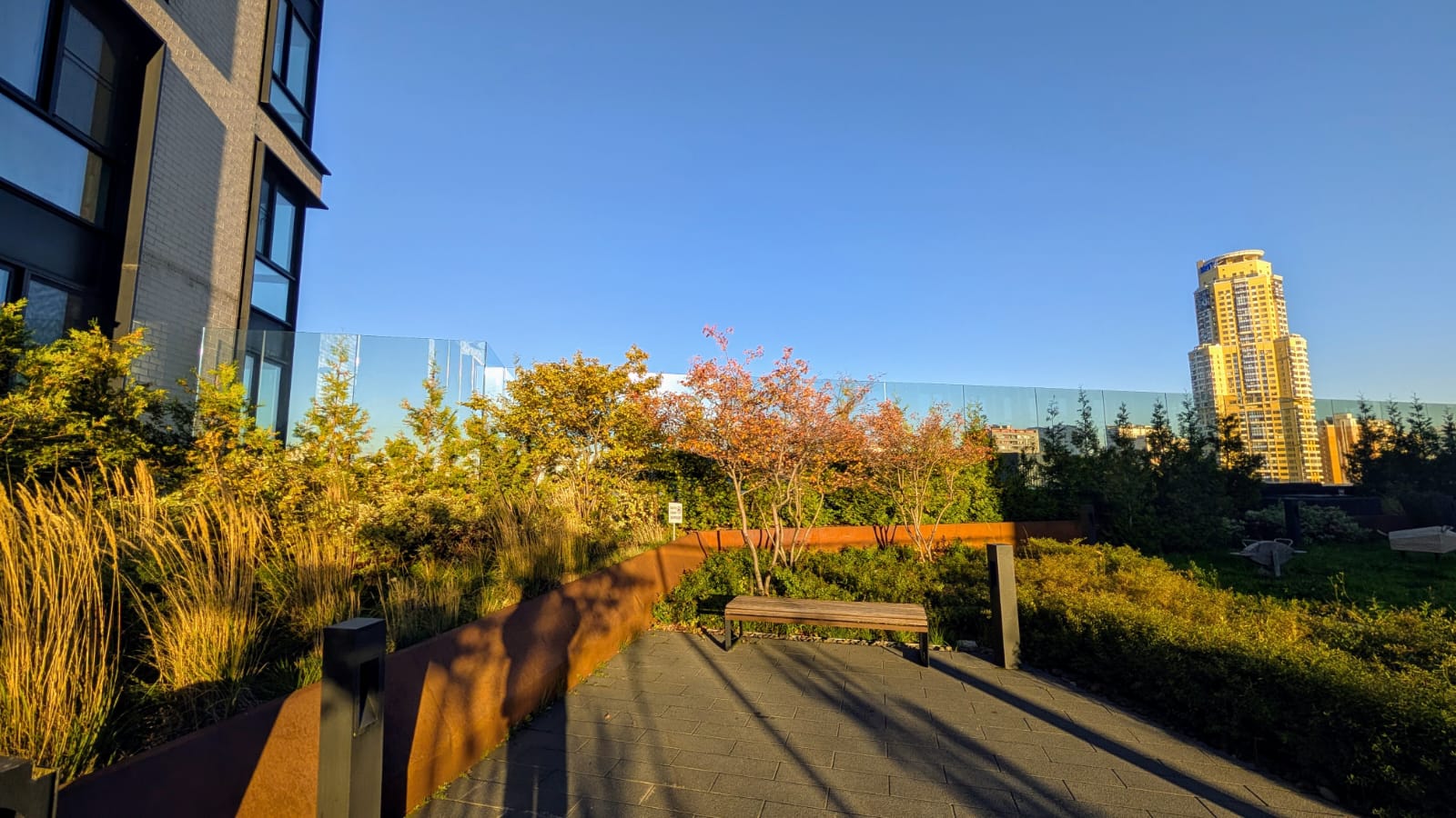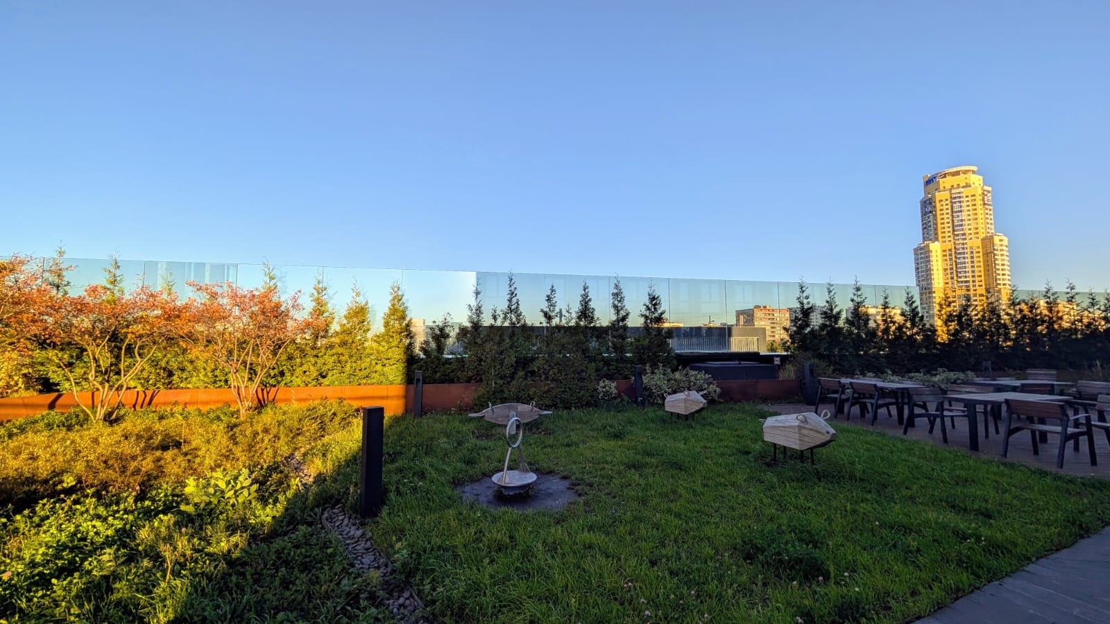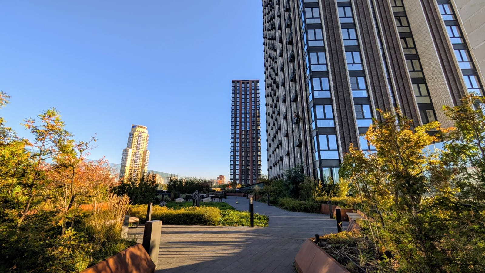4 башни ЖК бизнес класса Дискавери Парк соединяет большой стилобат со скамейками, прогулочной зоной, тренажёрами и качелями для детей, вход только для собственников. Квартира находится на шестом этаже, отсюда как раз выход на стилобат.